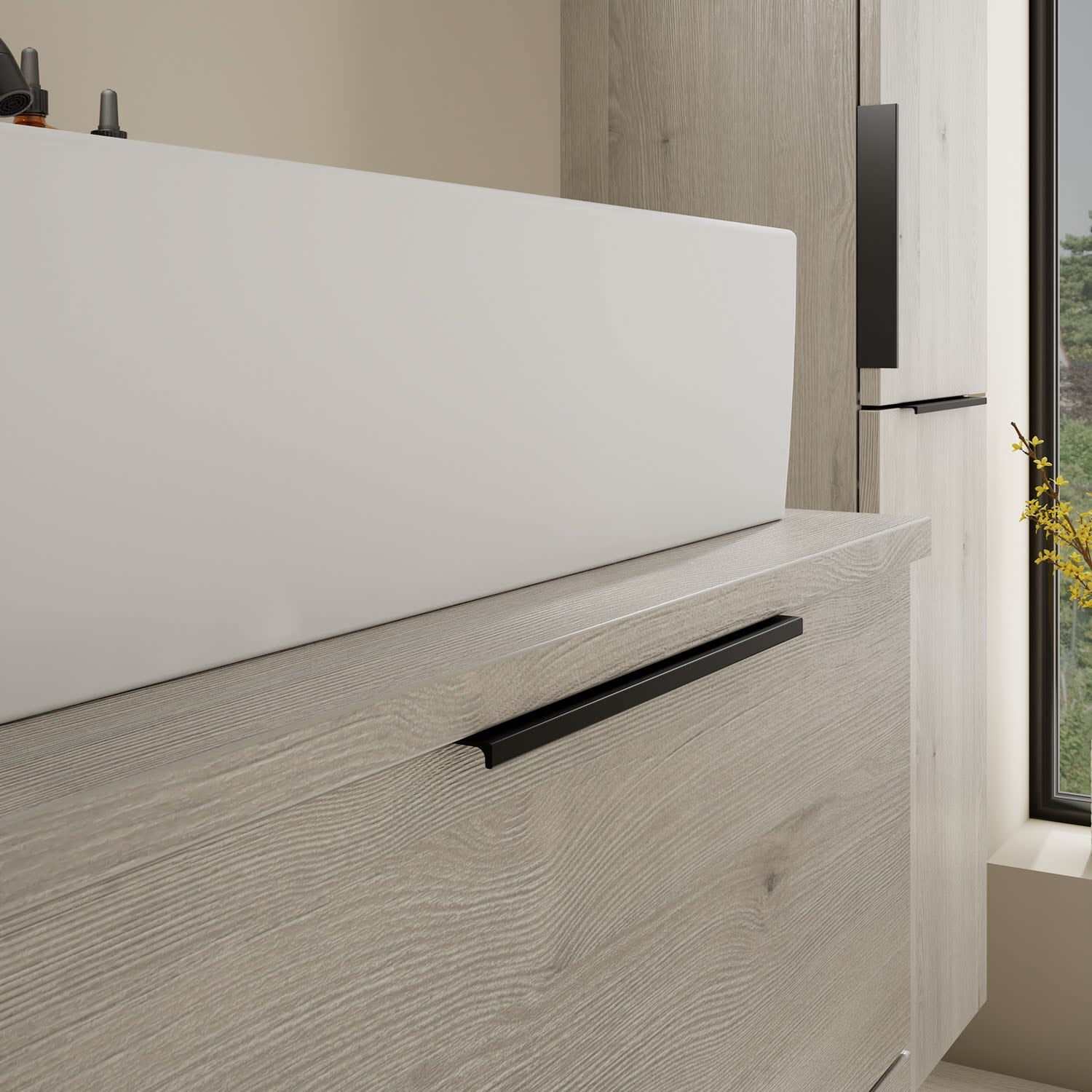 - 1 Schublade oben, 35 cm tief, mit Siphonausschnitt und Inneneinteilung