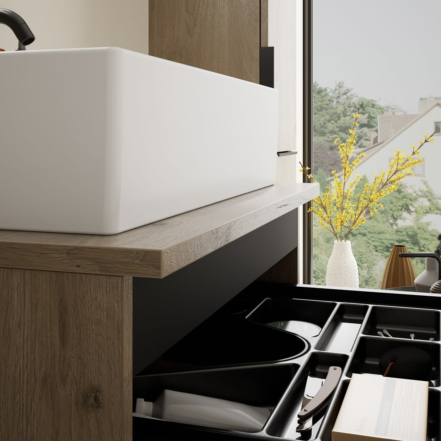 - 1 Schublade oben, 35 cm tief, mit Siphonausschnitt und Inneneinteilung