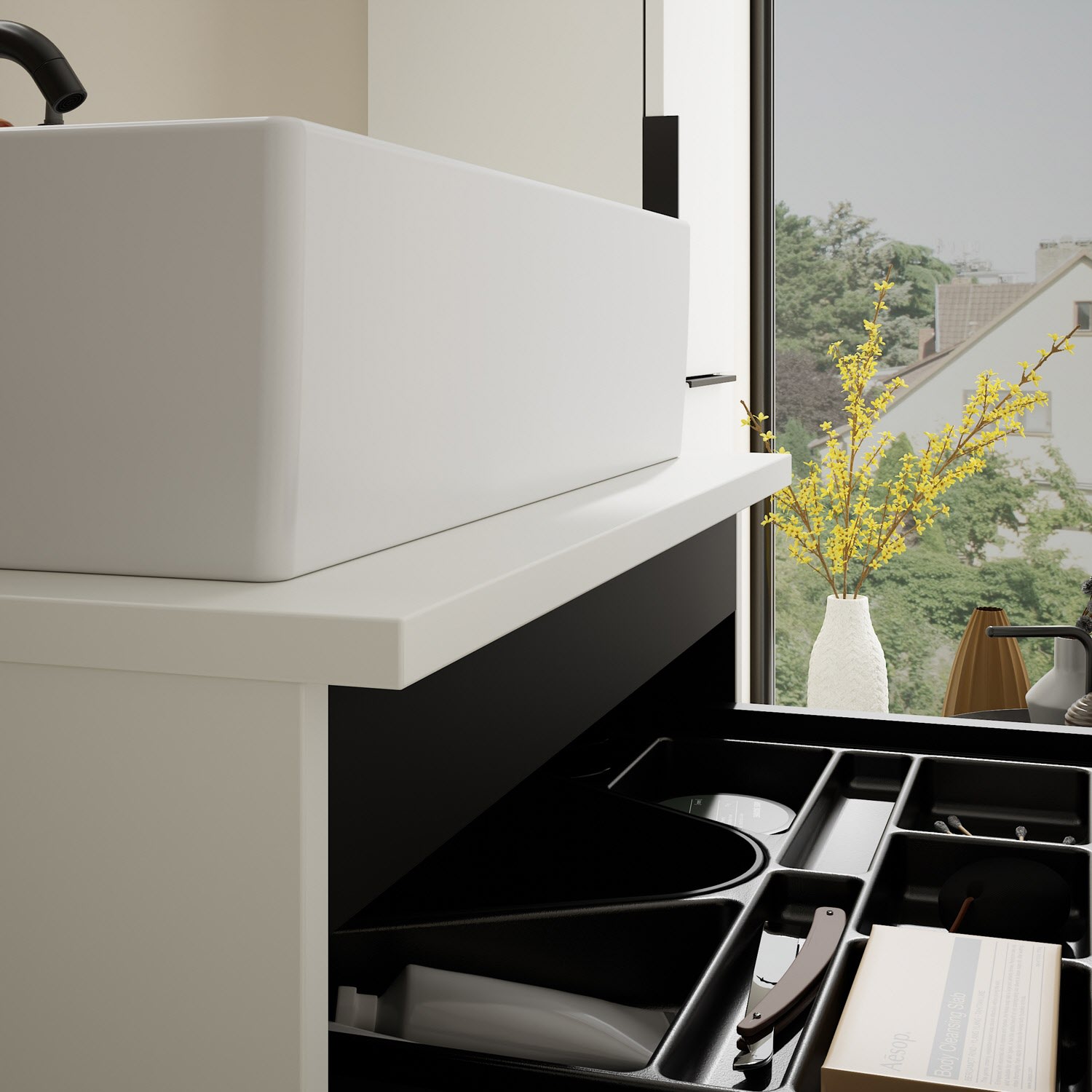 - 1 Schublade oben, 35 cm tief, mit Siphonausschnitt und Inneneinteilung