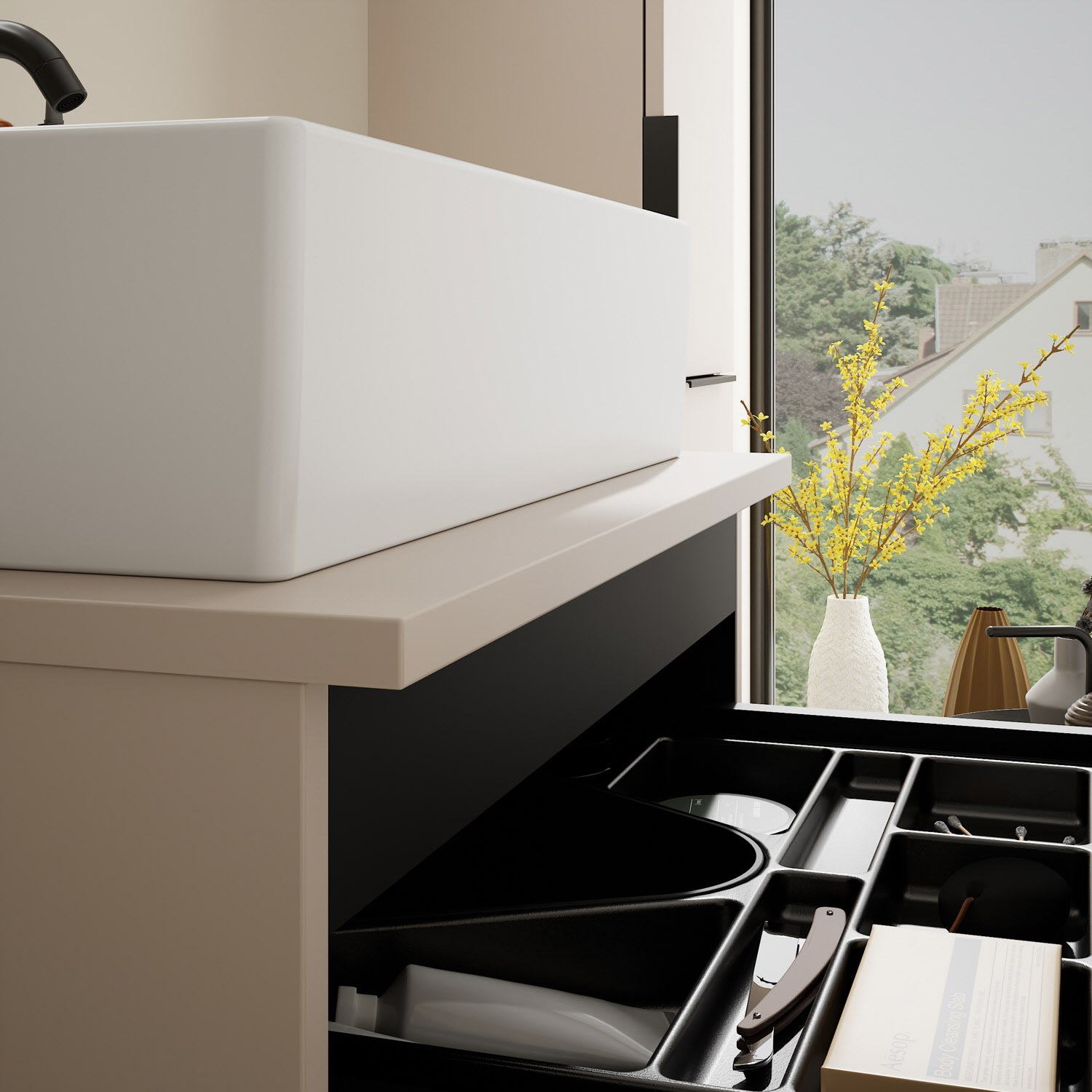 - 1 Schublade oben, 35 cm tief, mit Siphonausschnitt und Inneneinteilung