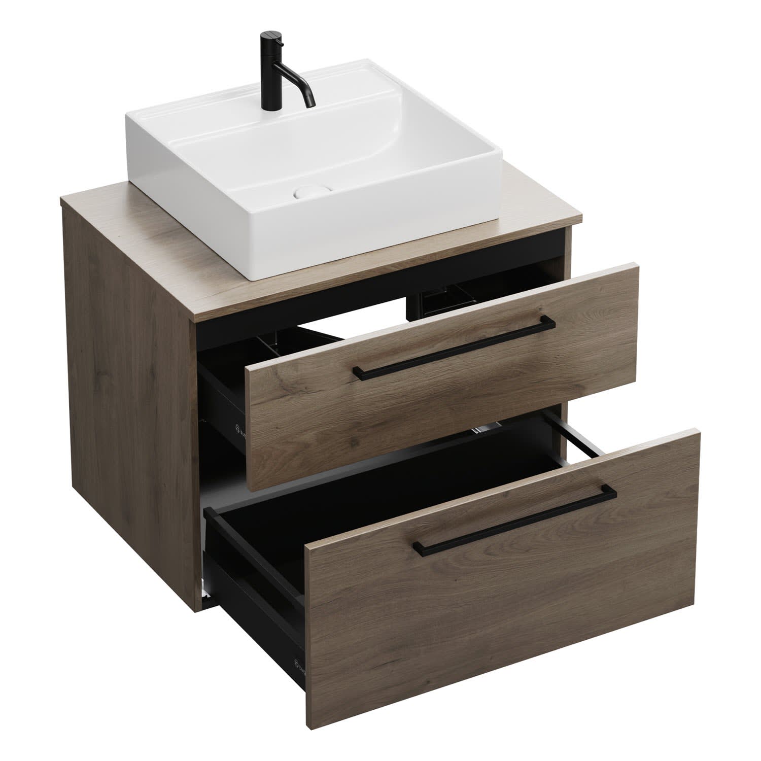 - 1 Schublade oben, 35 cm tief, mit Siphonausschnitt und Inneneinteilung