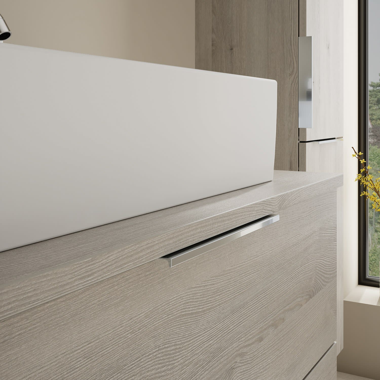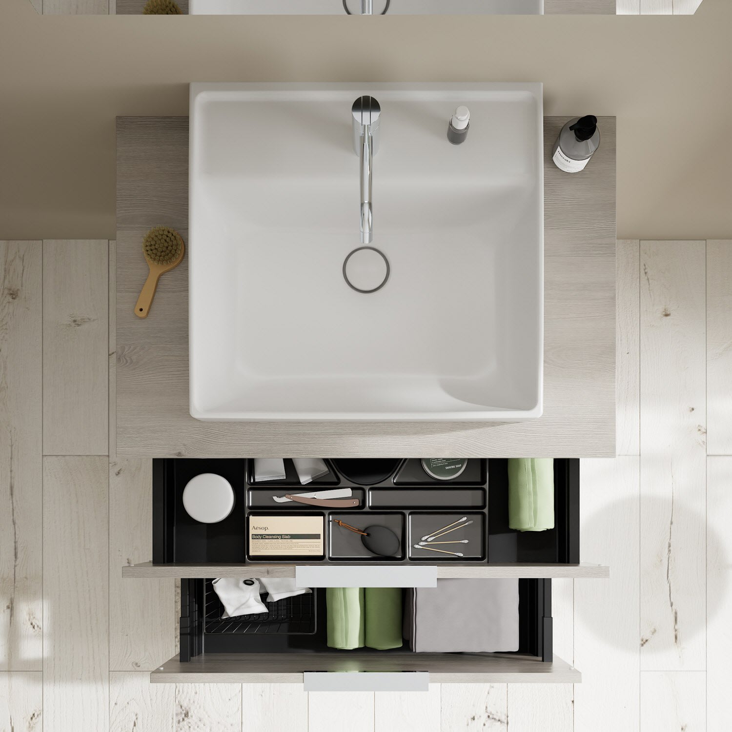 - 1 Schublade oben, 35 cm tief, mit Siphonausschnitt und Inneneinteilung