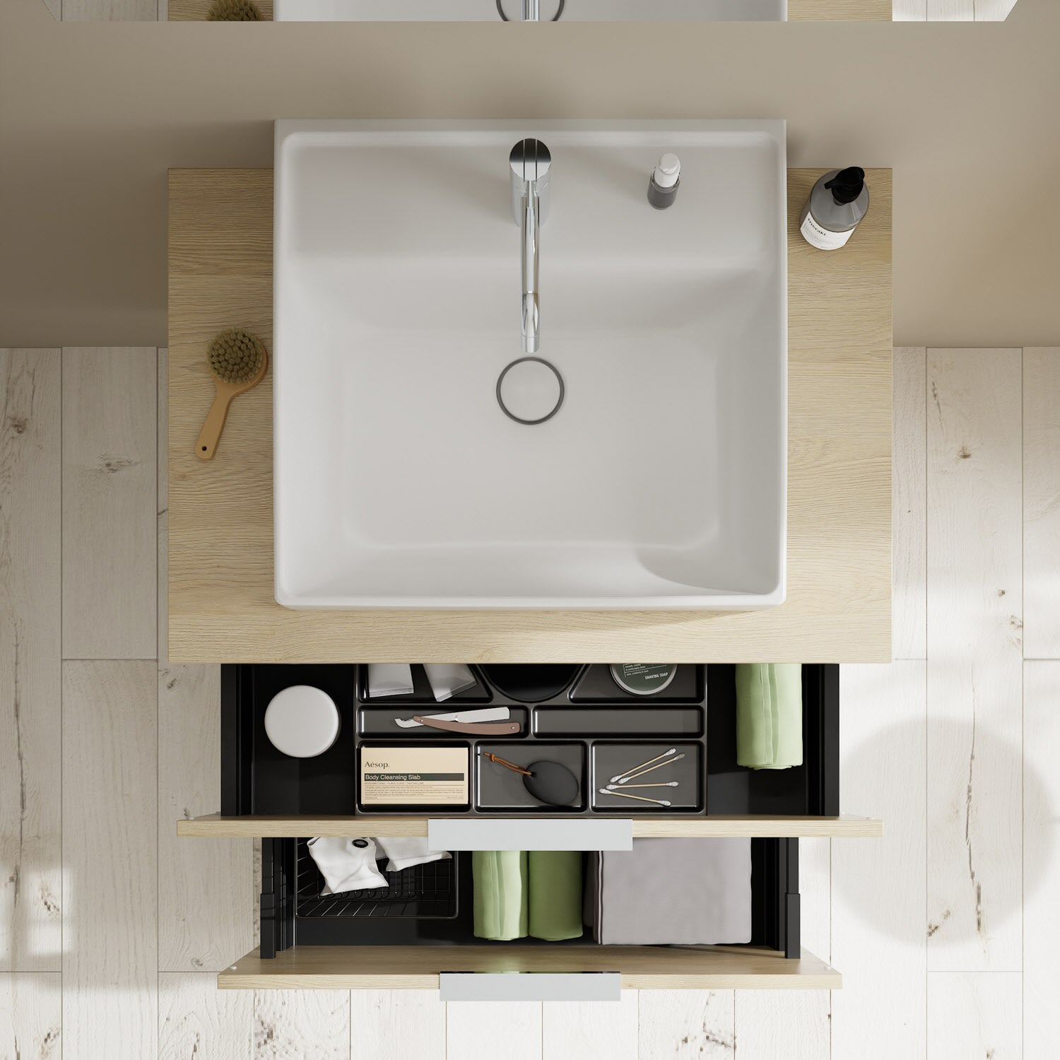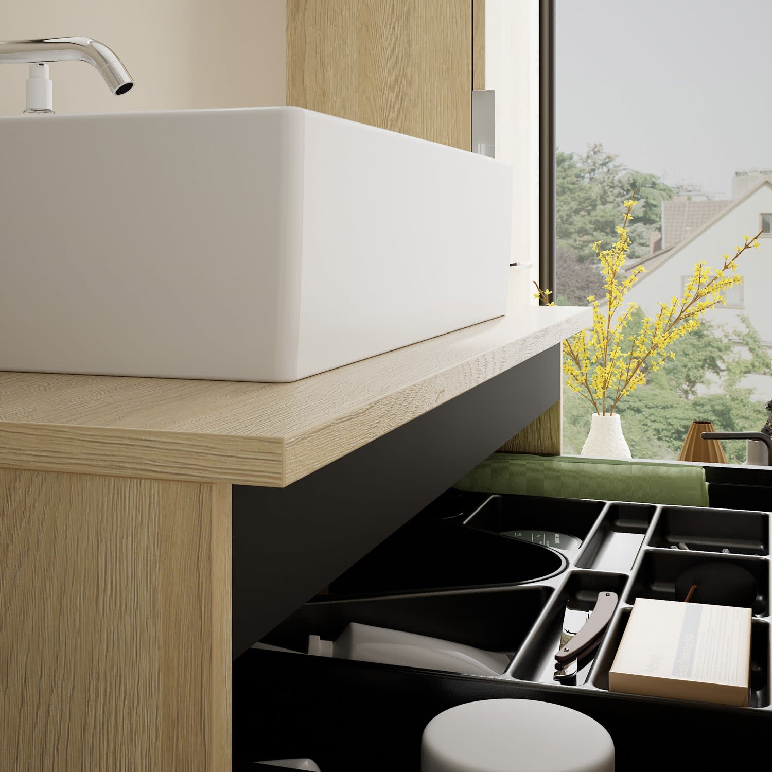 - 1 Schublade oben, 35 cm tief, mit Siphonausschnitt und Inneneinteilung