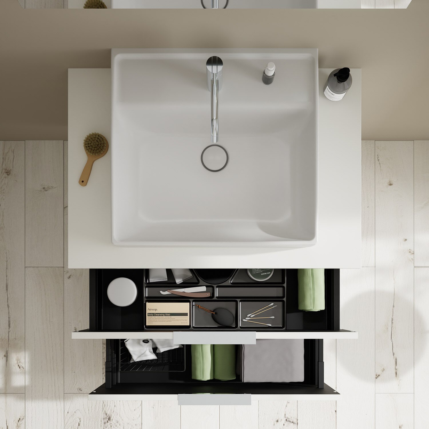 - 1 Schublade oben, 35 cm tief, mit Siphonausschnitt und Inneneinteilung