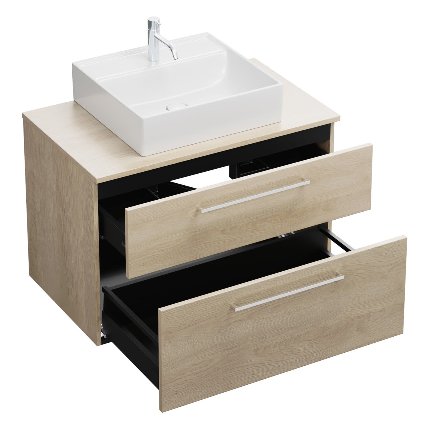 - 1 Schublade oben, 35 cm tief, mit Siphonausschnitt und Inneneinteilung