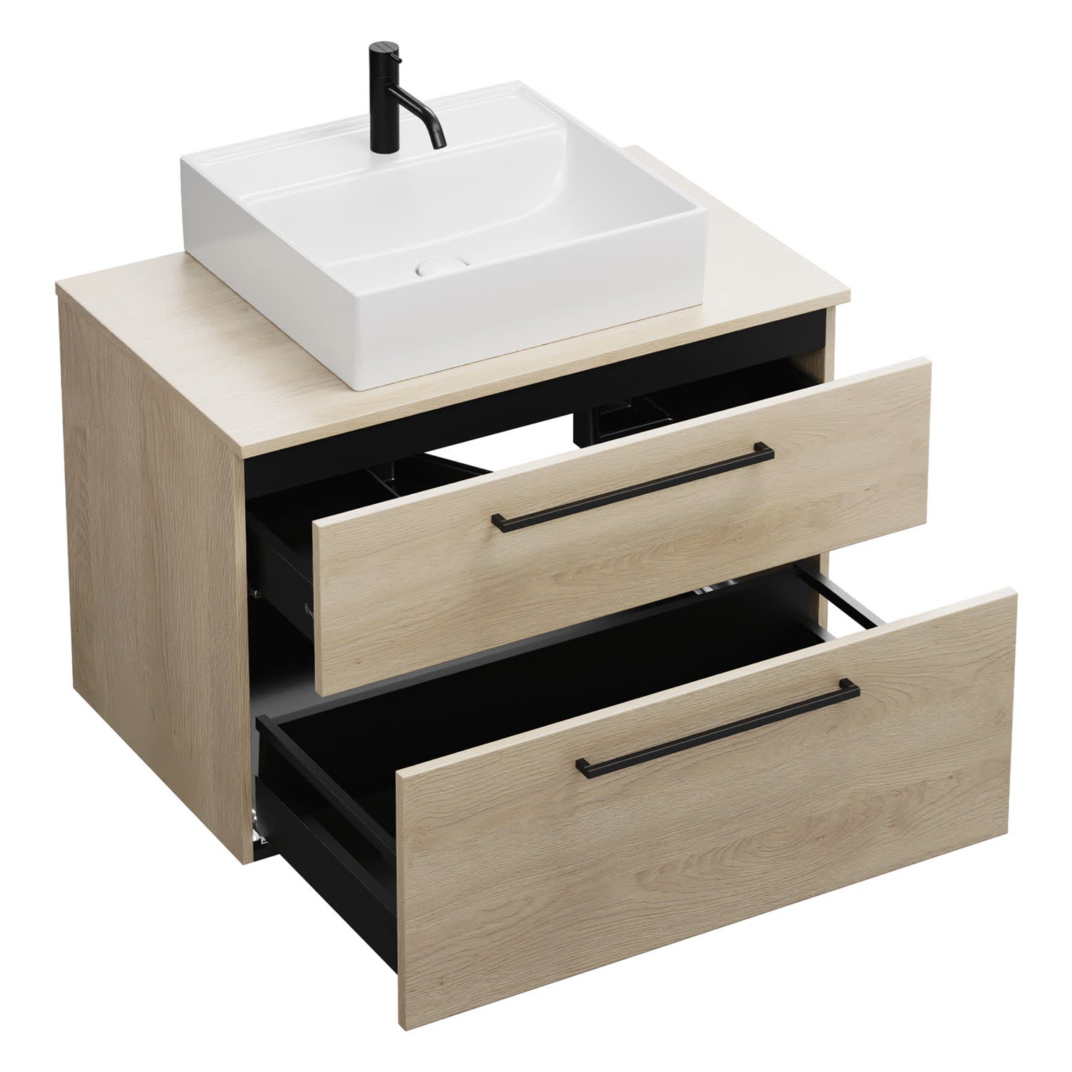 - 1 Schublade oben, 35 cm tief, mit Siphonausschnitt und Inneneinteilung