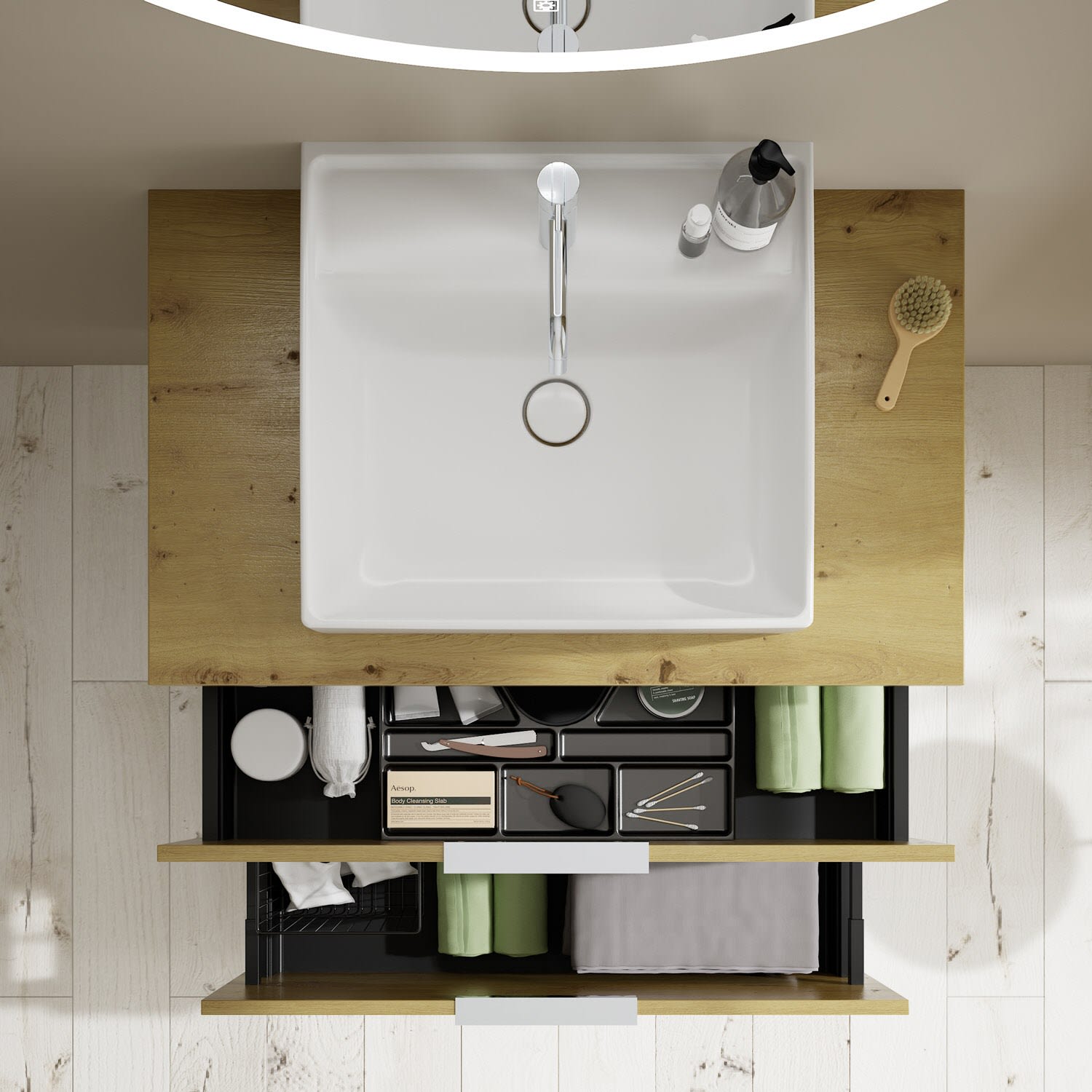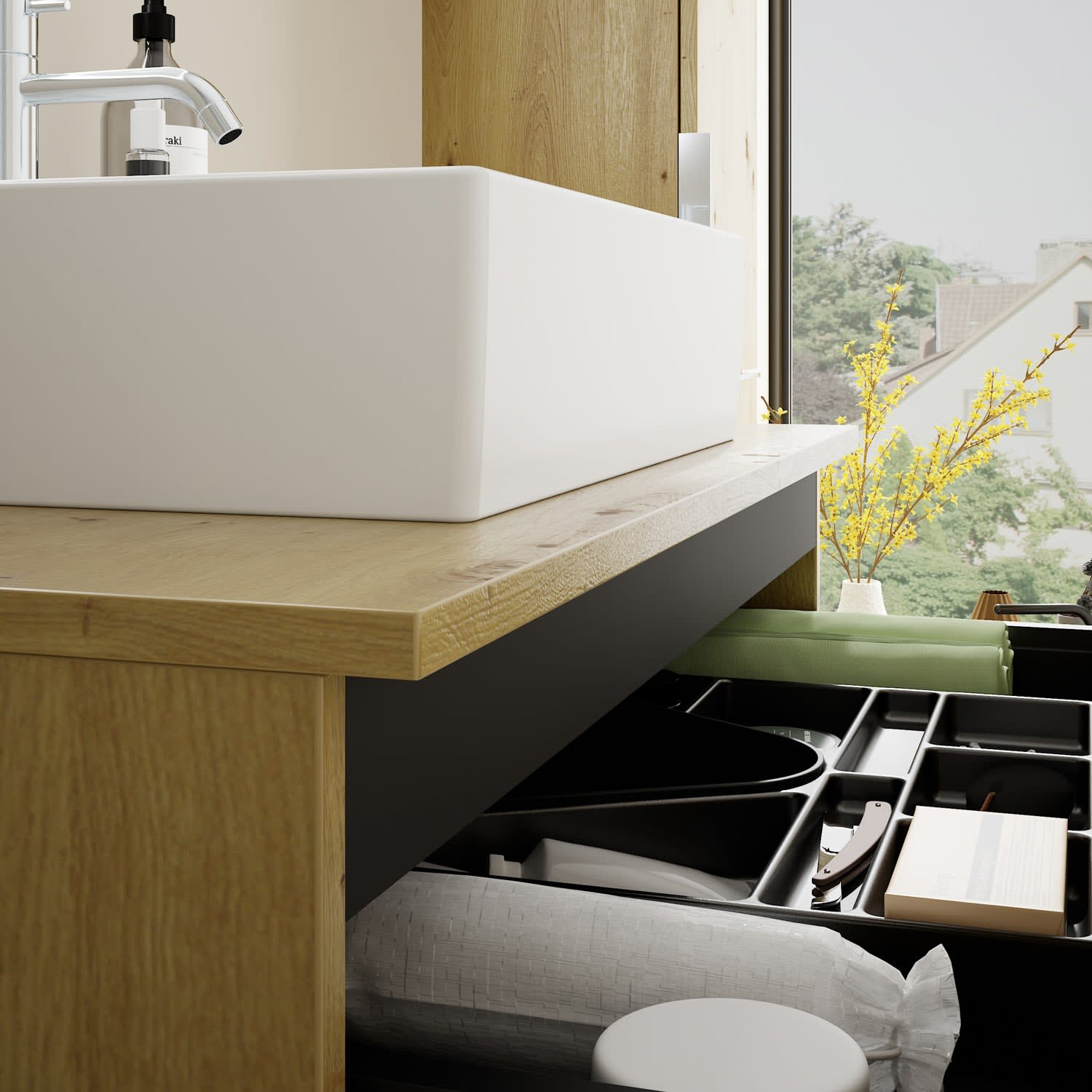 - 1 Schublade oben, 35 cm tief, mit Siphonausschnitt und Inneneinteilung