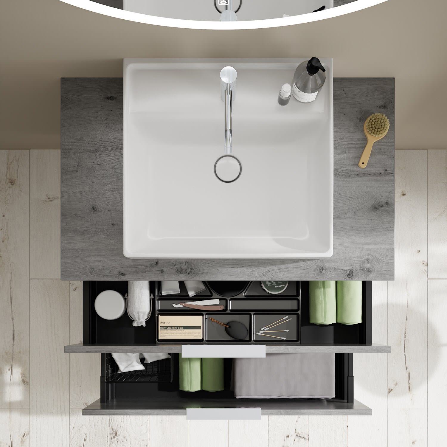 - 1 Schublade oben, 35 cm tief, mit Siphonausschnitt und Inneneinteilung