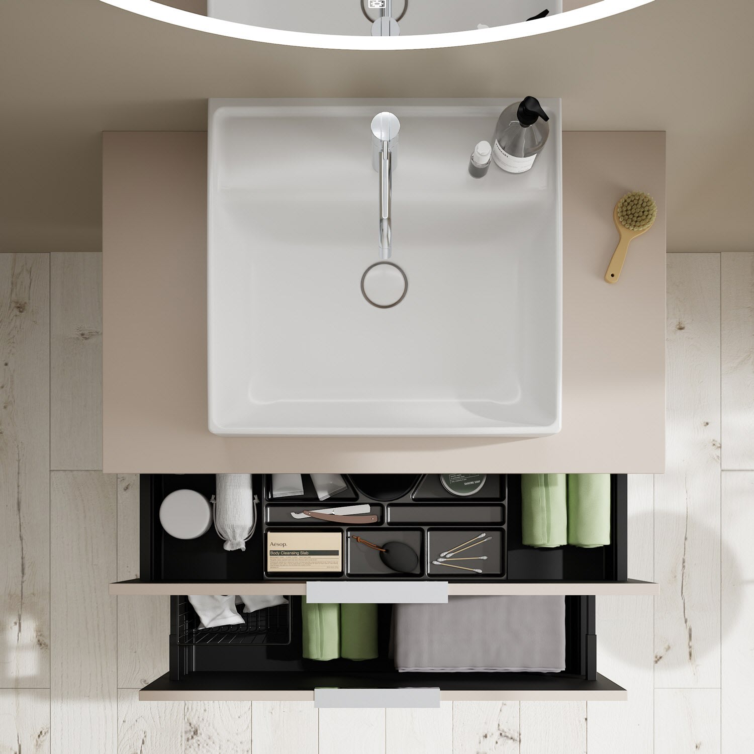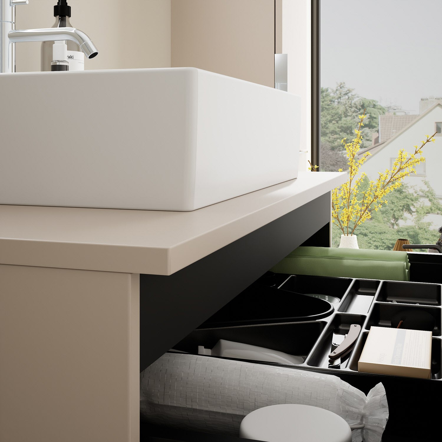 - 1 Schublade oben, 35 cm tief, mit Siphonausschnitt und Inneneinteilung