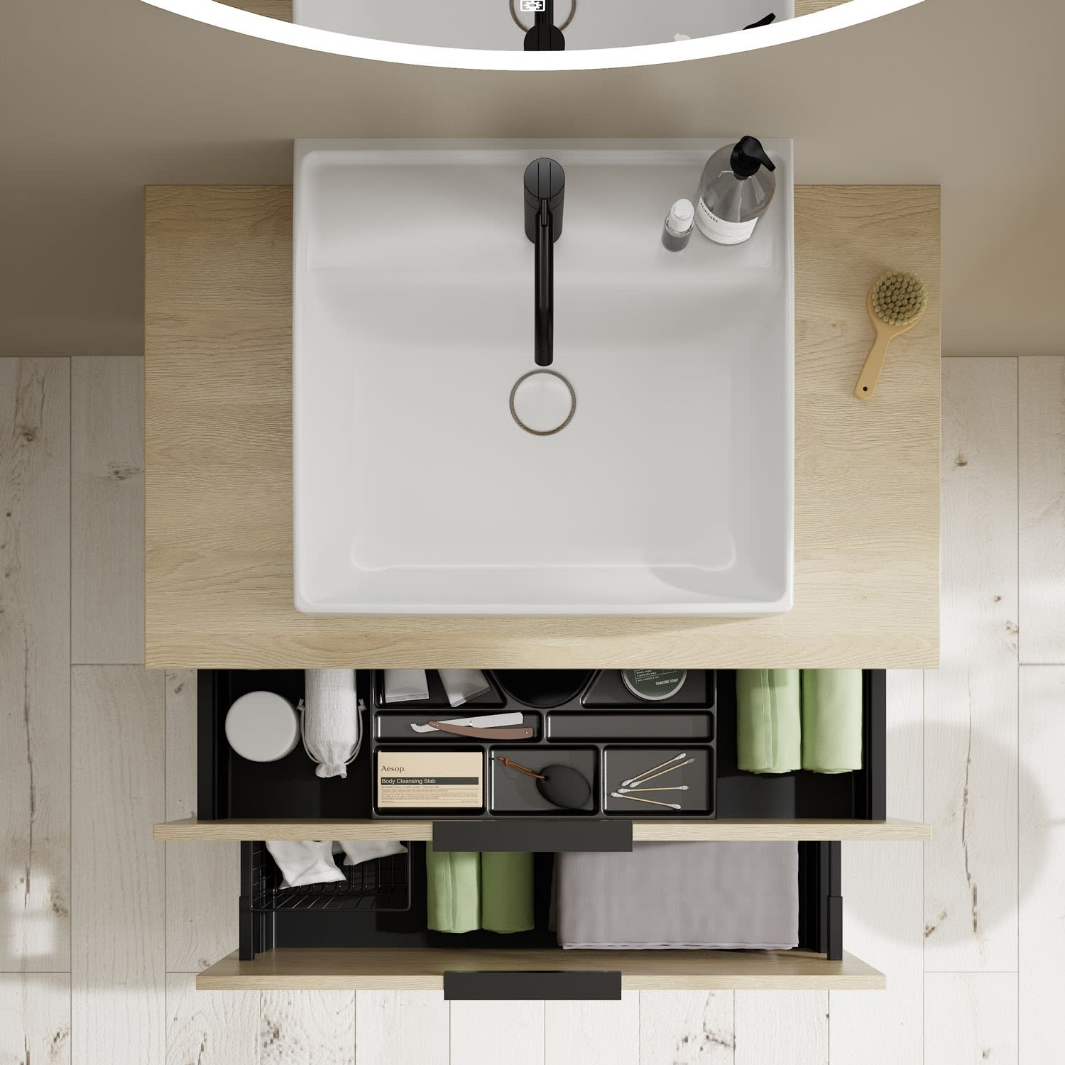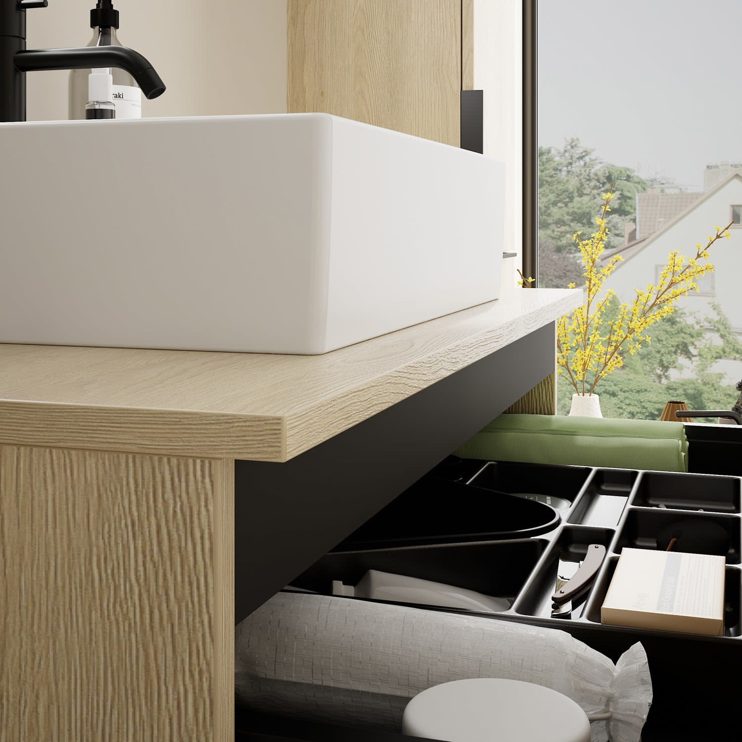 - 1 Schublade oben, 35 cm tief, mit Siphonausschnitt und Inneneinteilung