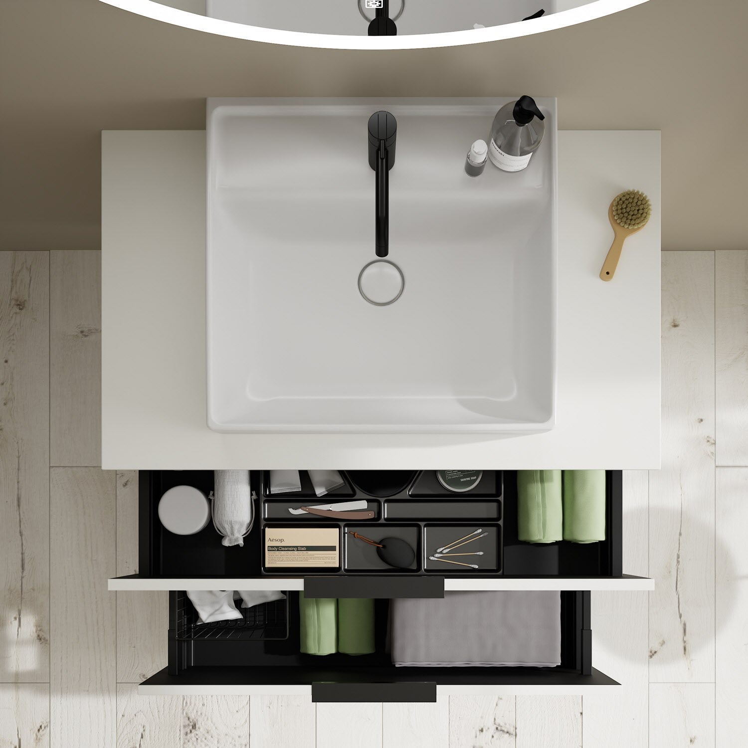 - 1 Schublade oben, 35 cm tief, mit Siphonausschnitt und Inneneinteilung