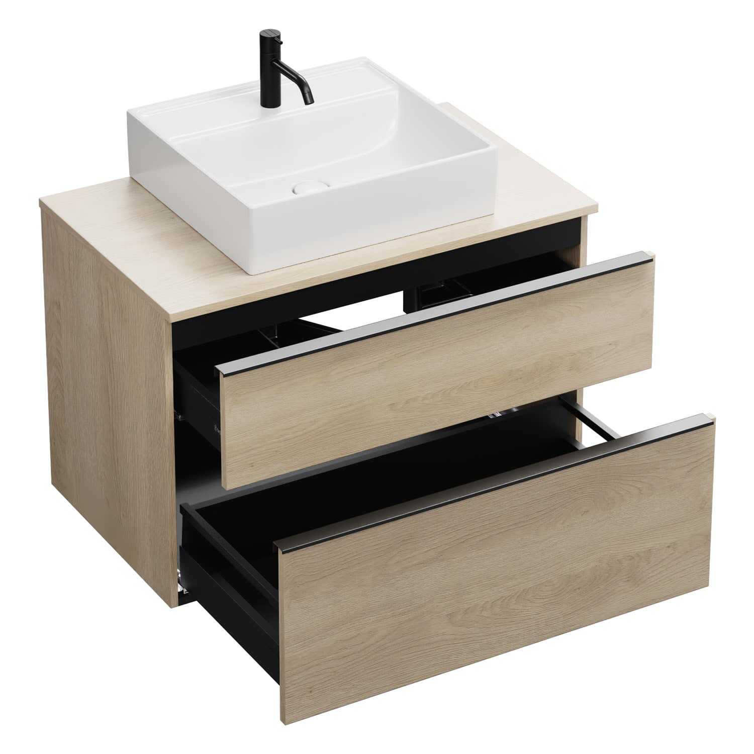 - 1 Schublade oben, 35 cm tief, mit Siphonausschnitt und Inneneinteilung