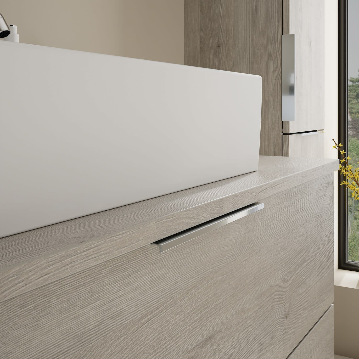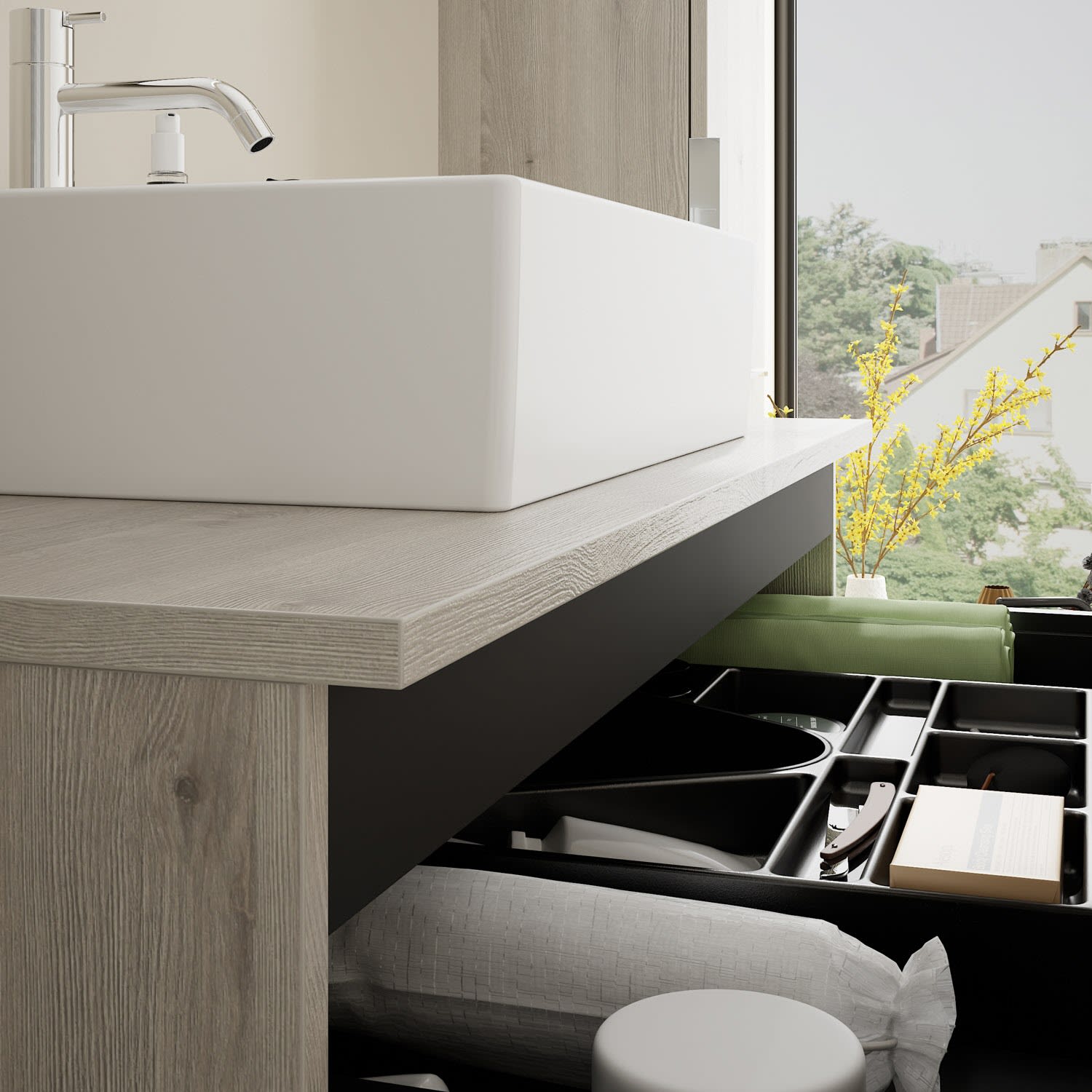 - 1 Schublade oben, 35 cm tief, mit Siphonausschnitt und Inneneinteilung