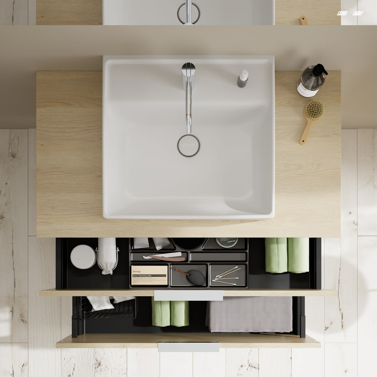 - 1 Schublade oben, 35 cm tief, mit Siphonausschnitt und Inneneinteilung