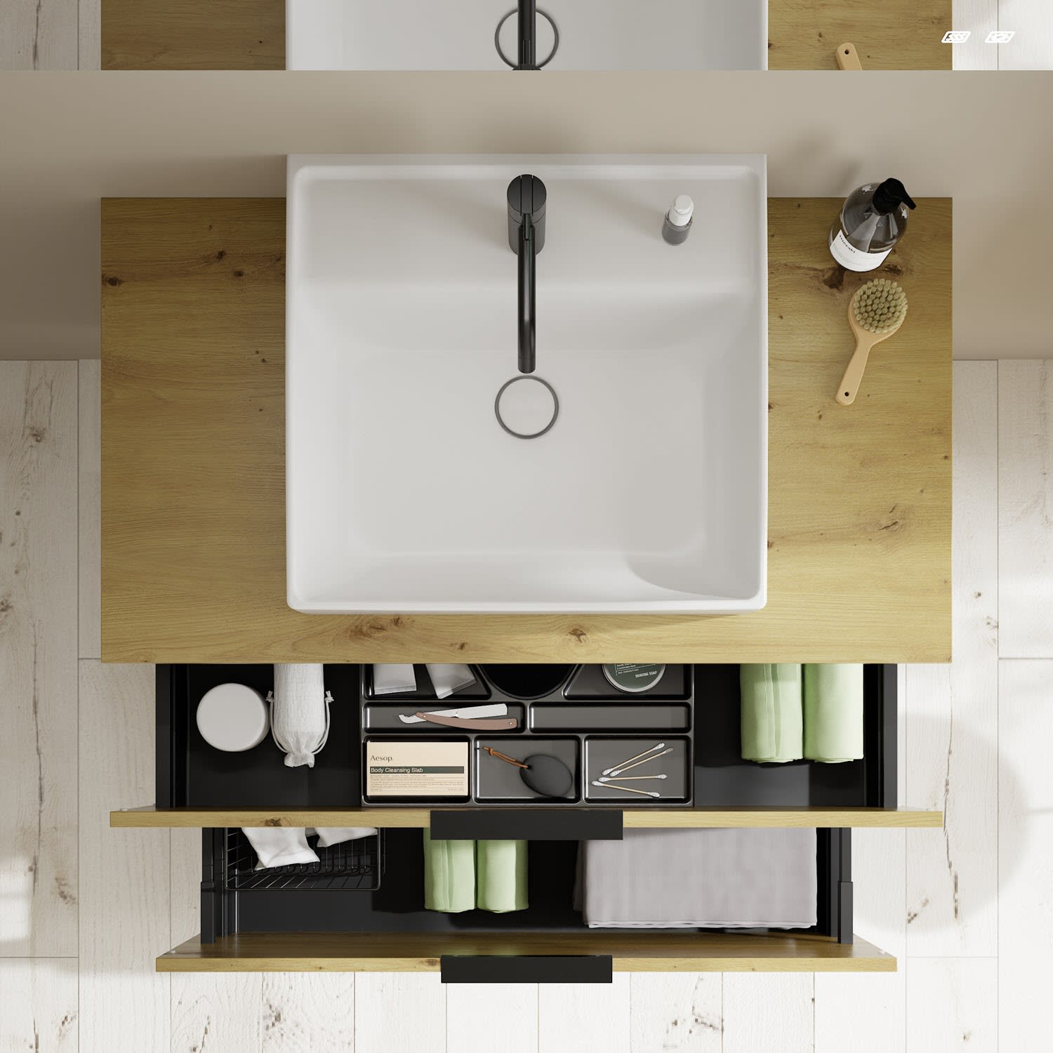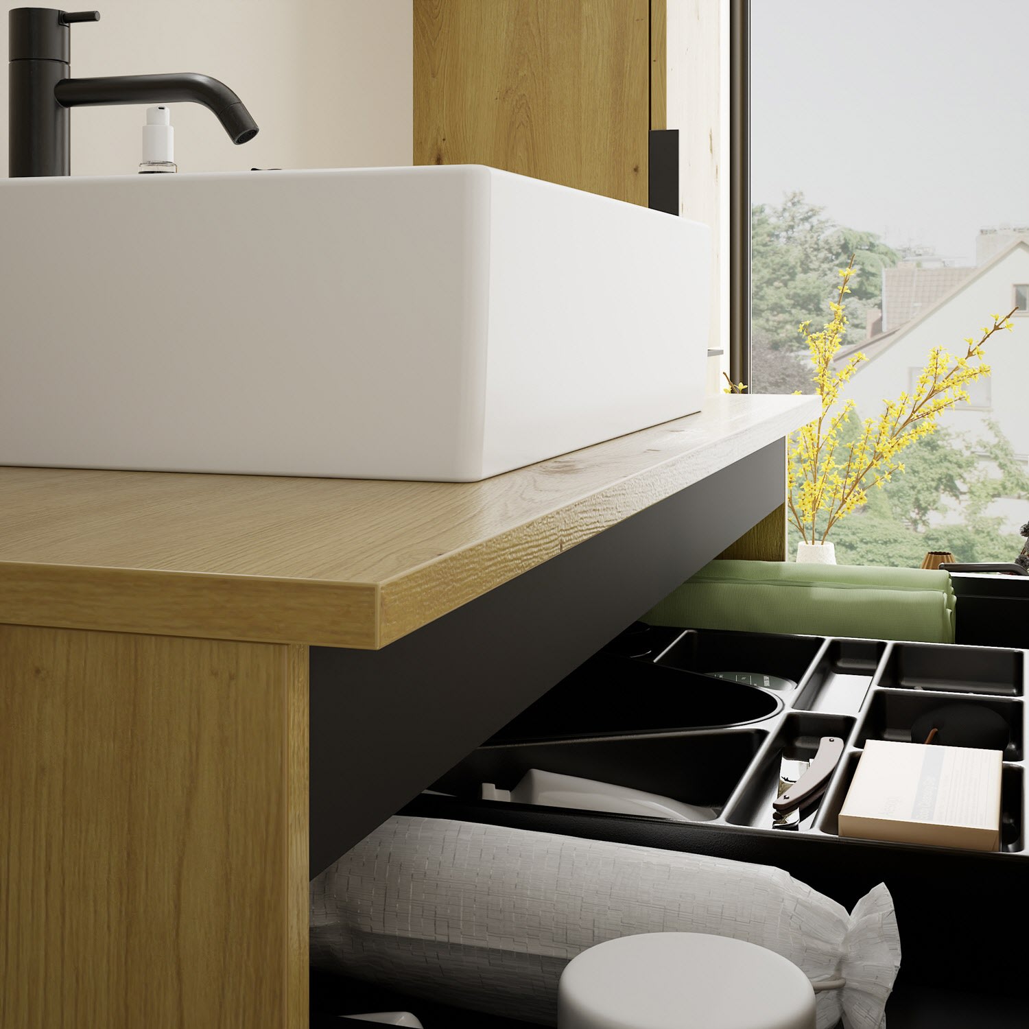 - 1 Schublade oben, 35 cm tief, mit Siphonausschnitt und Inneneinteilung
