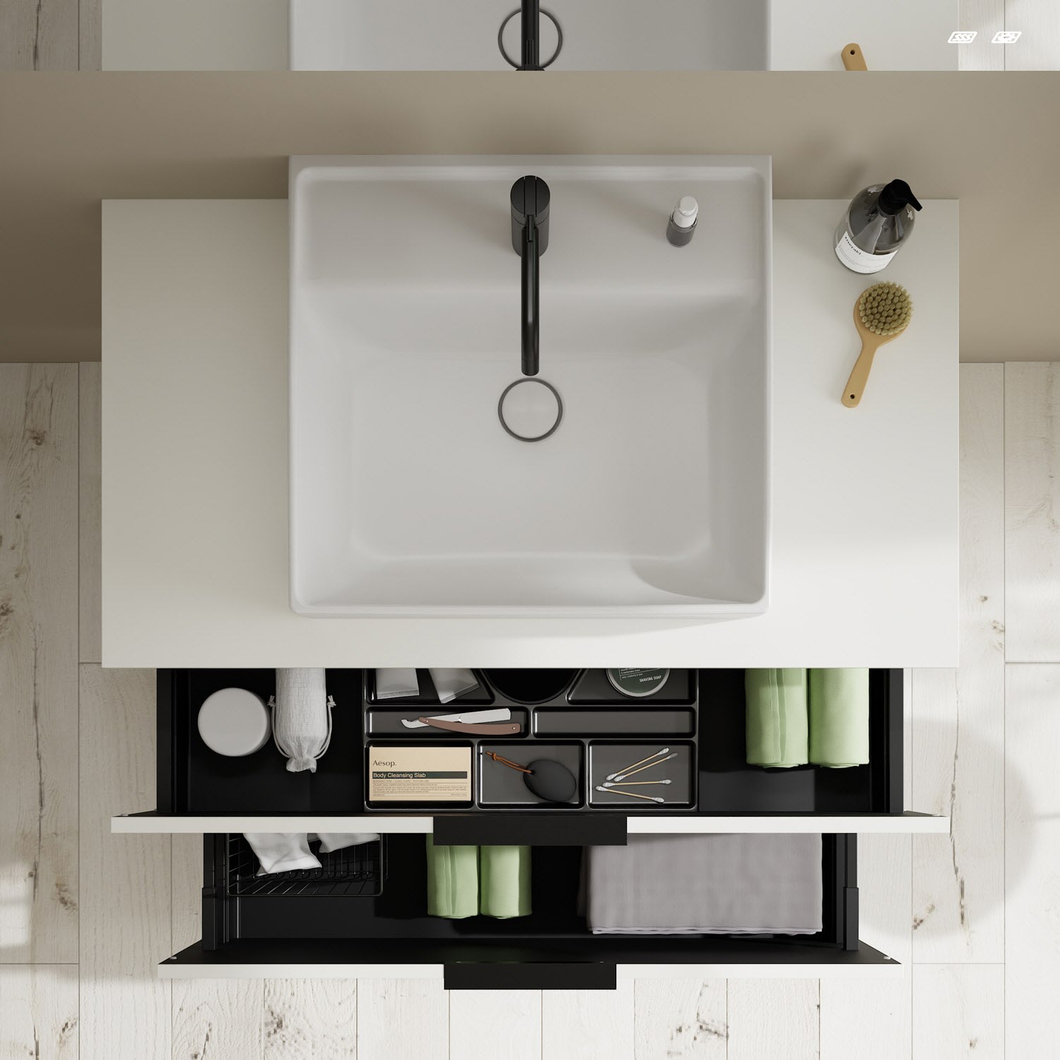 - 1 Schublade oben, 35 cm tief, mit Siphonausschnitt und Inneneinteilung