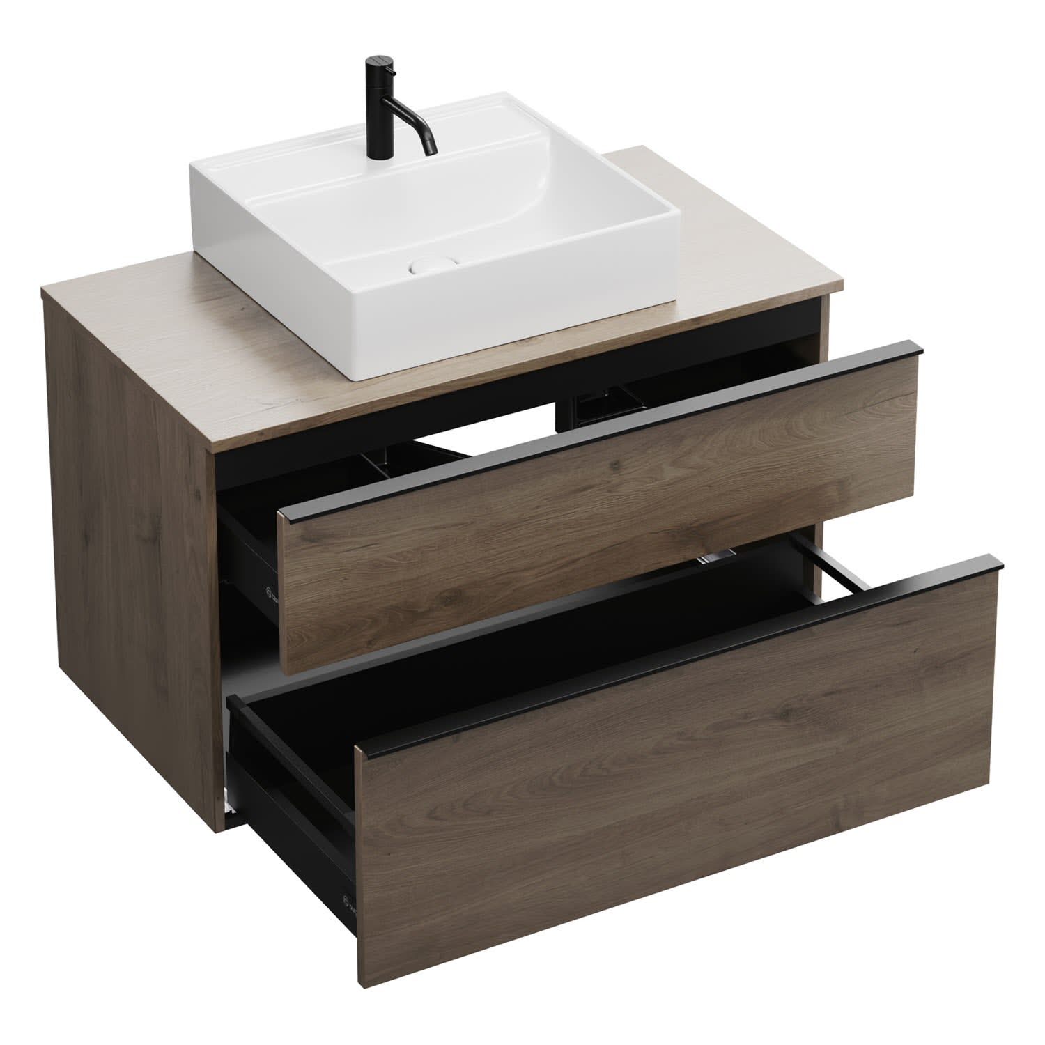 - 1 Schublade oben, 35 cm tief, mit Siphonausschnitt und Inneneinteilung