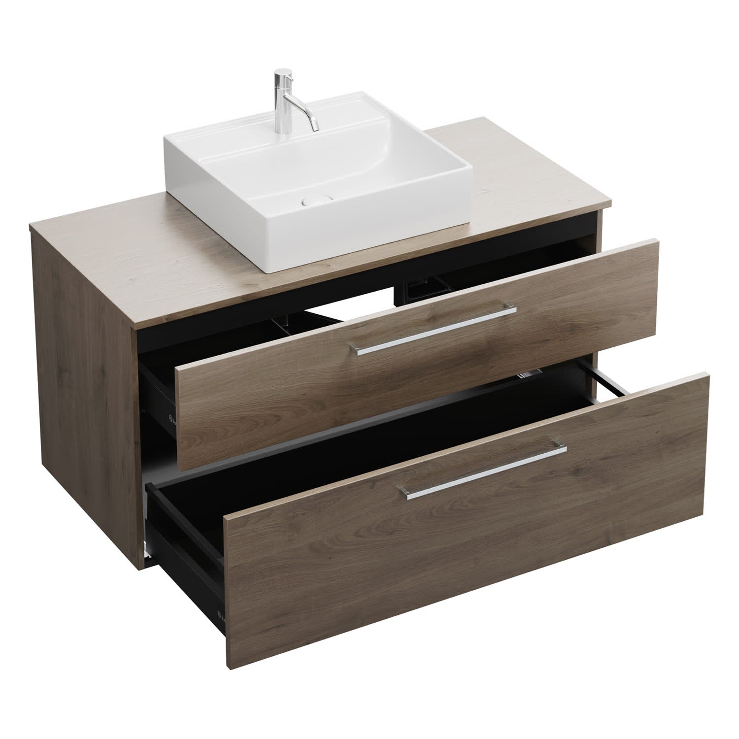 - 1 Schublade oben, 35 cm tief, mit Siphonausschnitt und Inneneinteilung