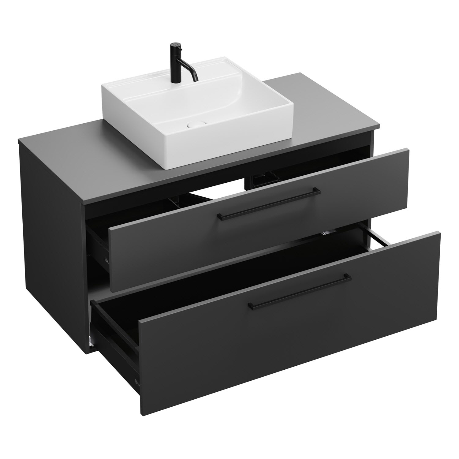 - 1 Schublade oben, 35 cm tief, mit Siphonausschnitt und Inneneinteilung