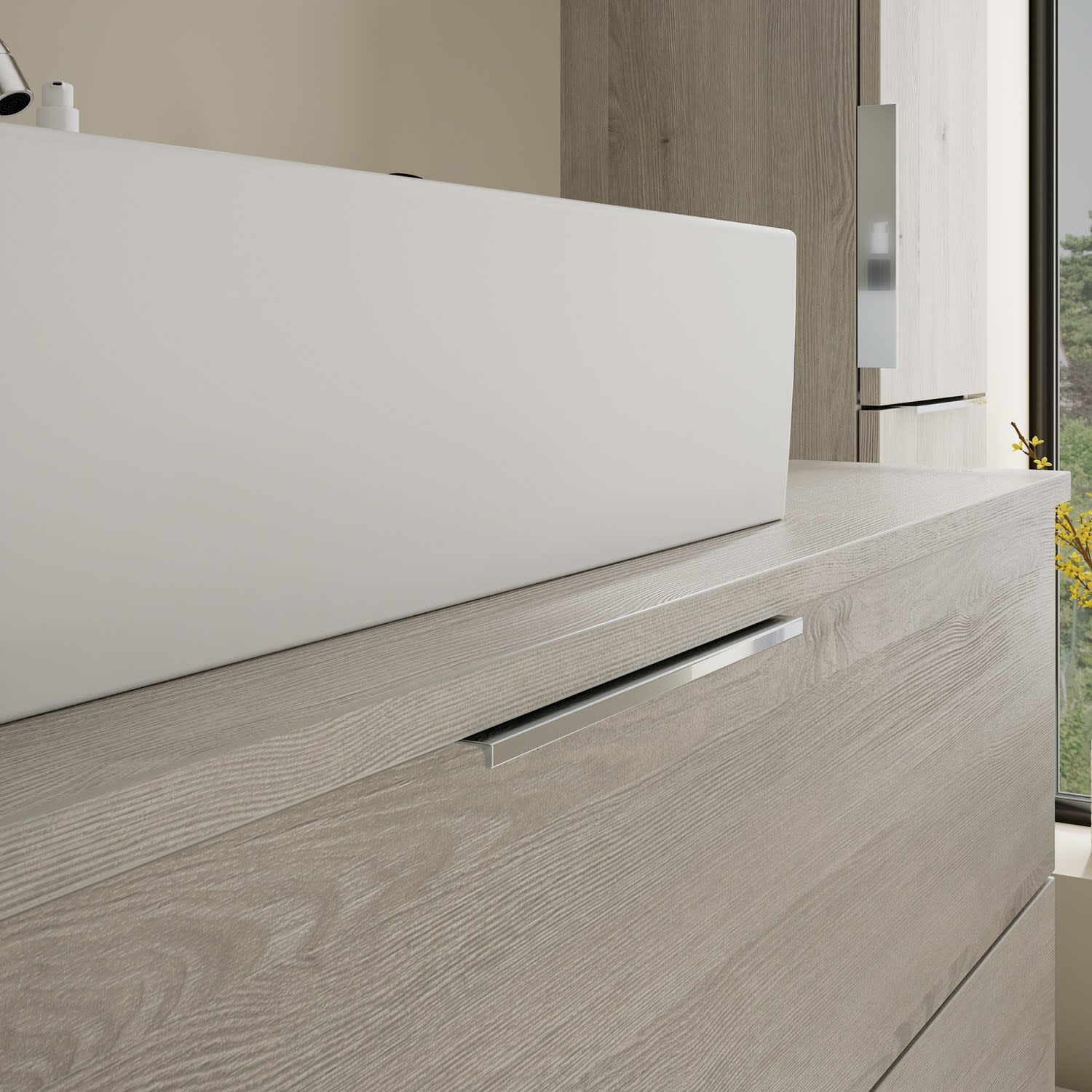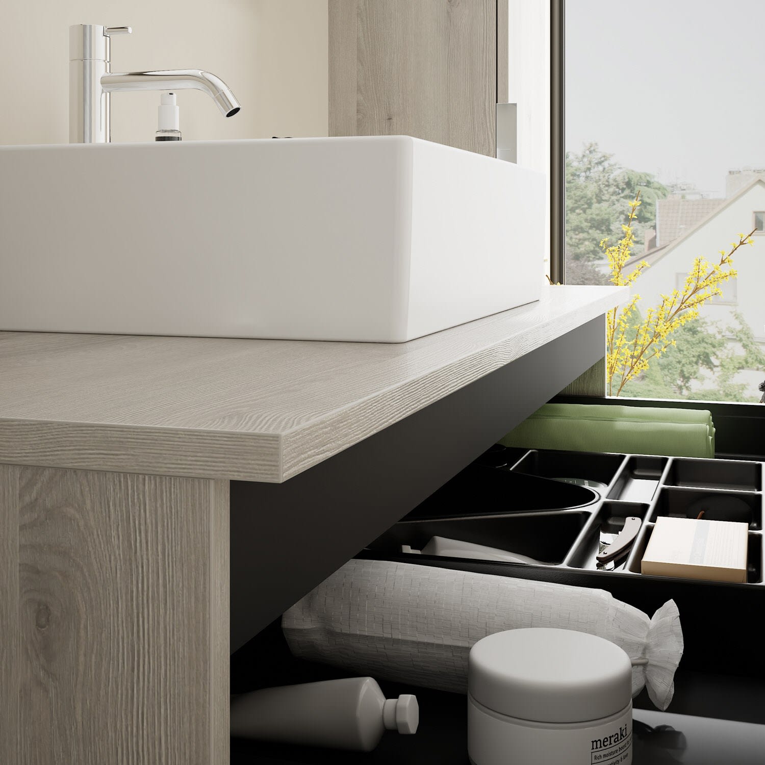 - 1 Schublade oben, 35 cm tief, mit Siphonausschnitt und Inneneinteilung