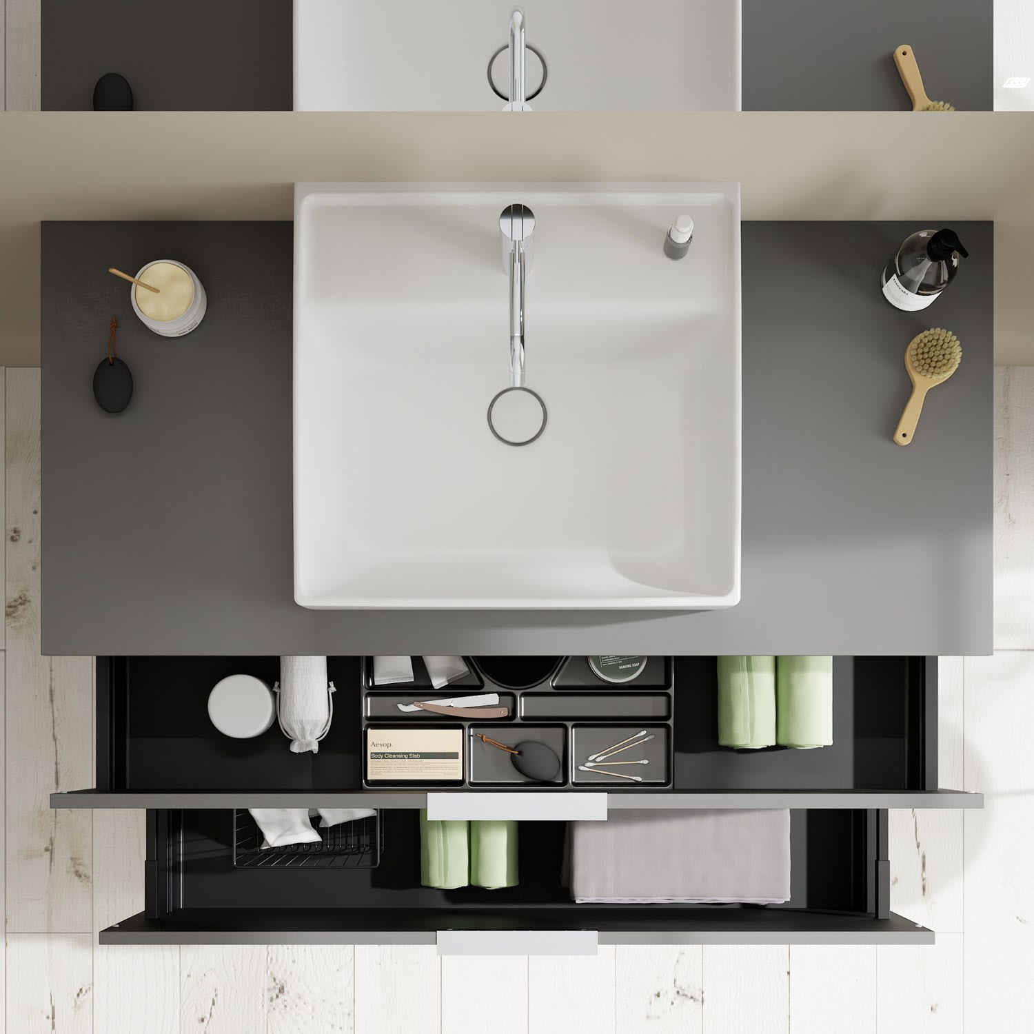 - 1 Schublade oben, 35 cm tief, mit Siphonausschnitt und Inneneinteilung