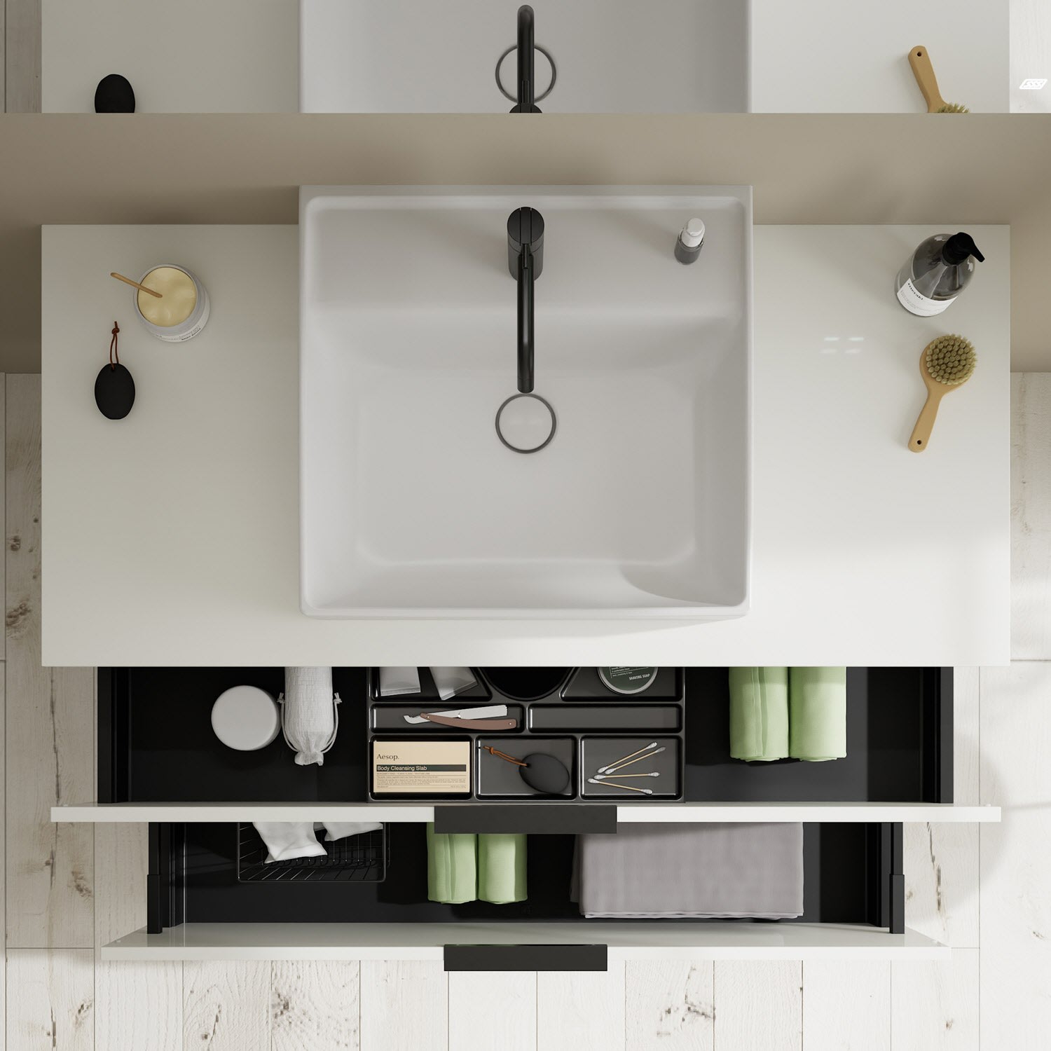 - 1 Schublade oben, 35 cm tief, mit Siphonausschnitt und Inneneinteilung