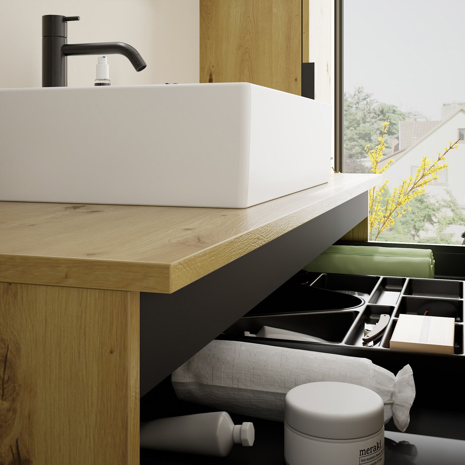 - 1 Schublade oben, 35 cm tief, mit Siphonausschnitt und Inneneinteilung