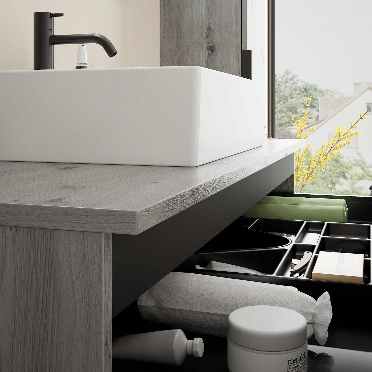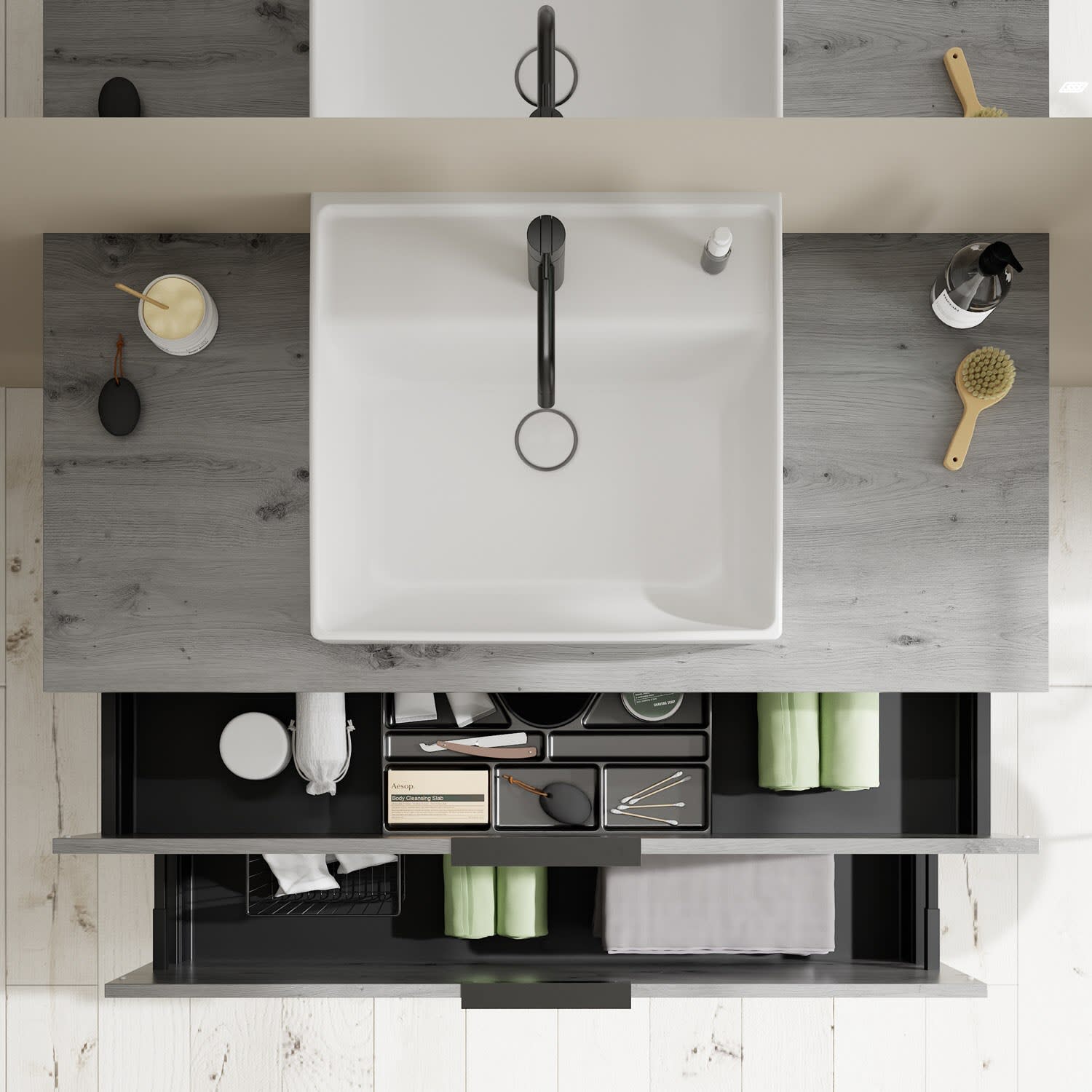 - 1 Schublade oben, 35 cm tief, mit Siphonausschnitt und Inneneinteilung