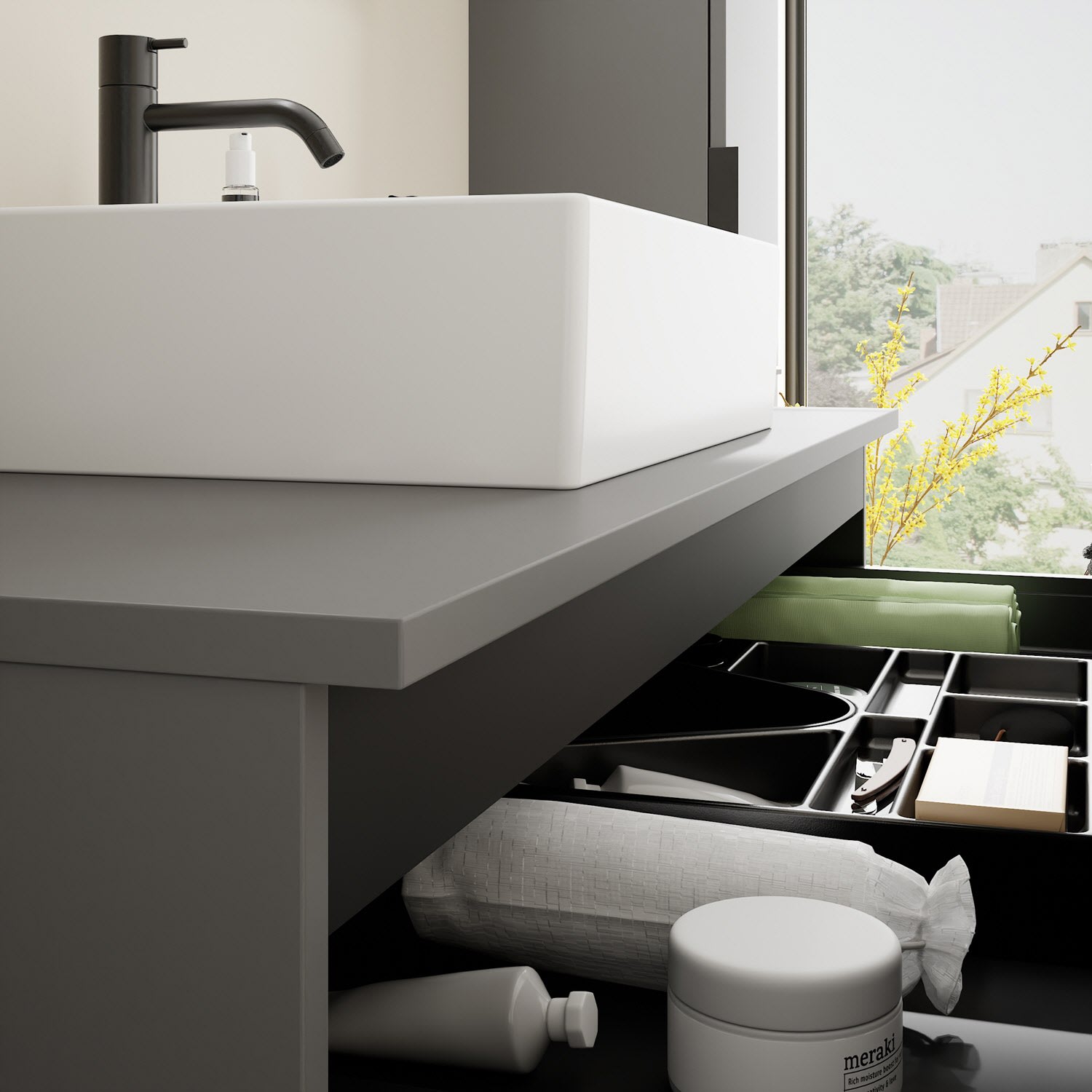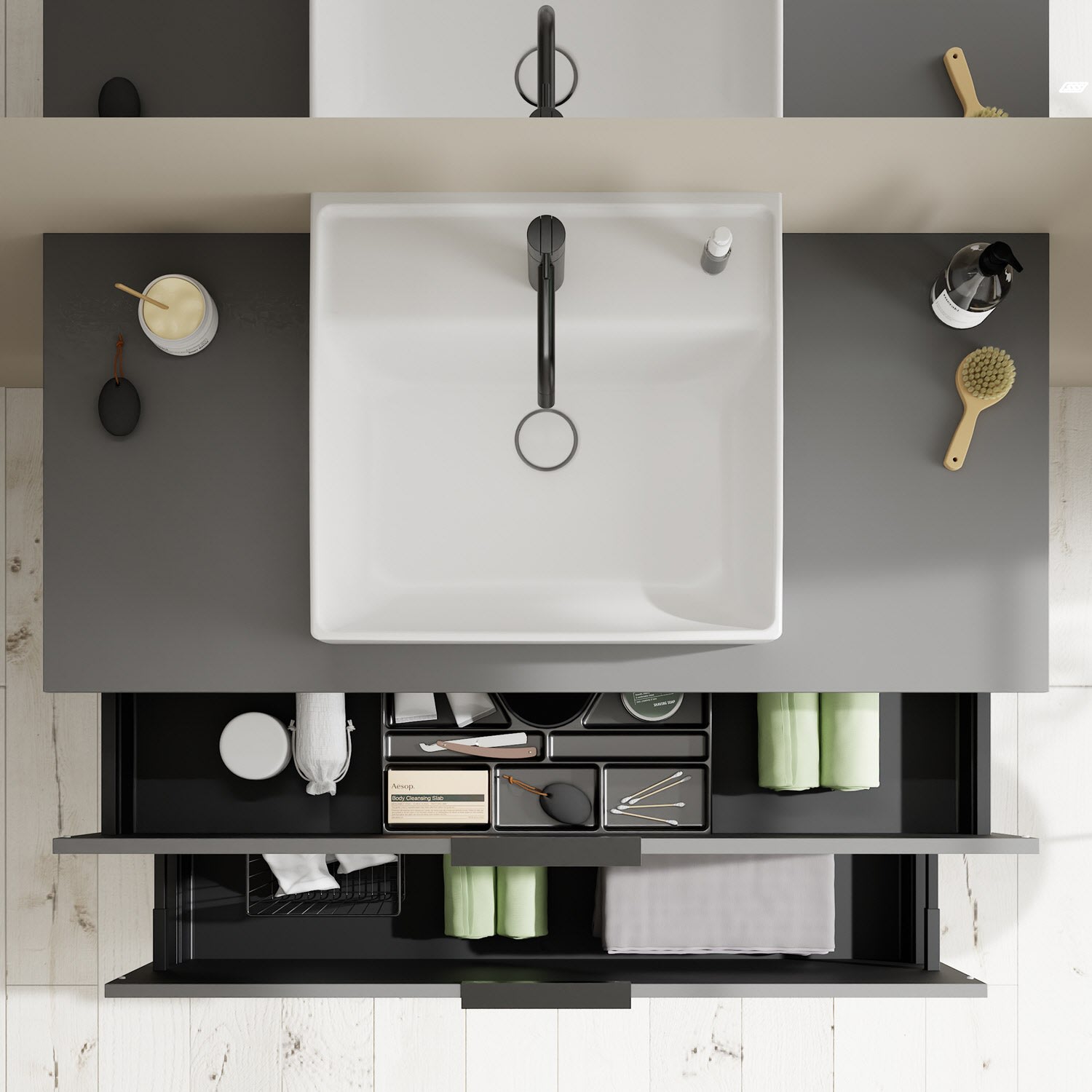 - 1 Schublade oben, 35 cm tief, mit Siphonausschnitt und Inneneinteilung