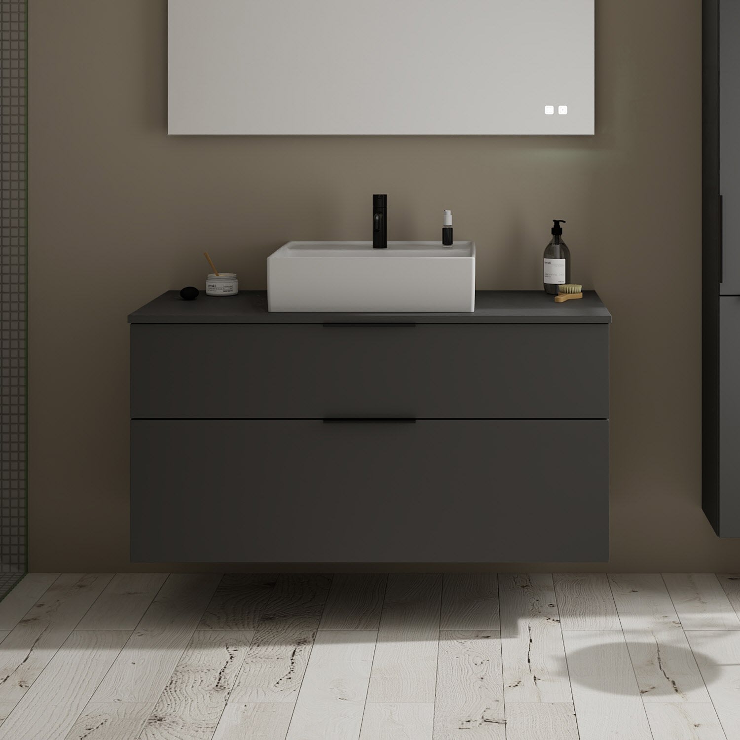 - Boden/Rückwand: Anthrazitgrau