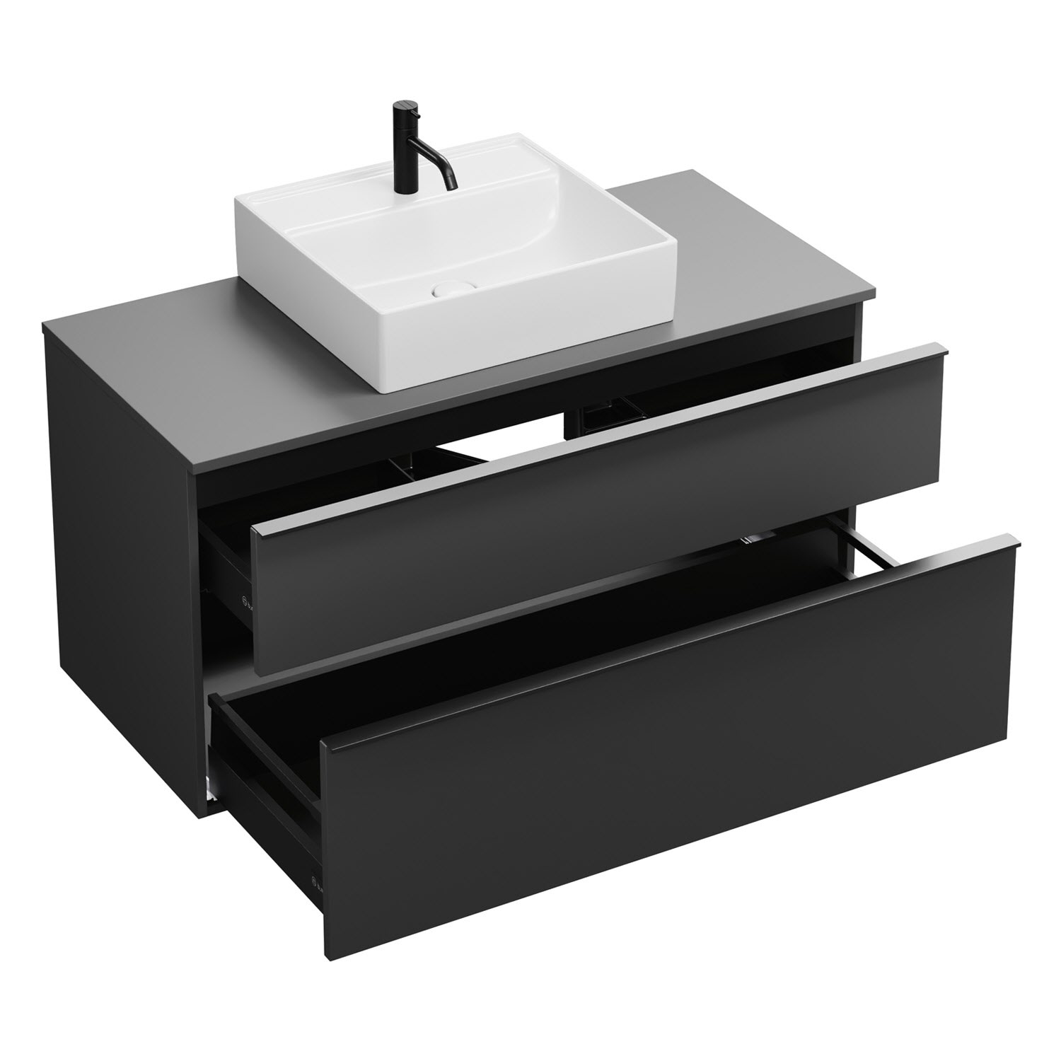 - 1 Schublade oben, 35 cm tief, mit Siphonausschnitt und Inneneinteilung