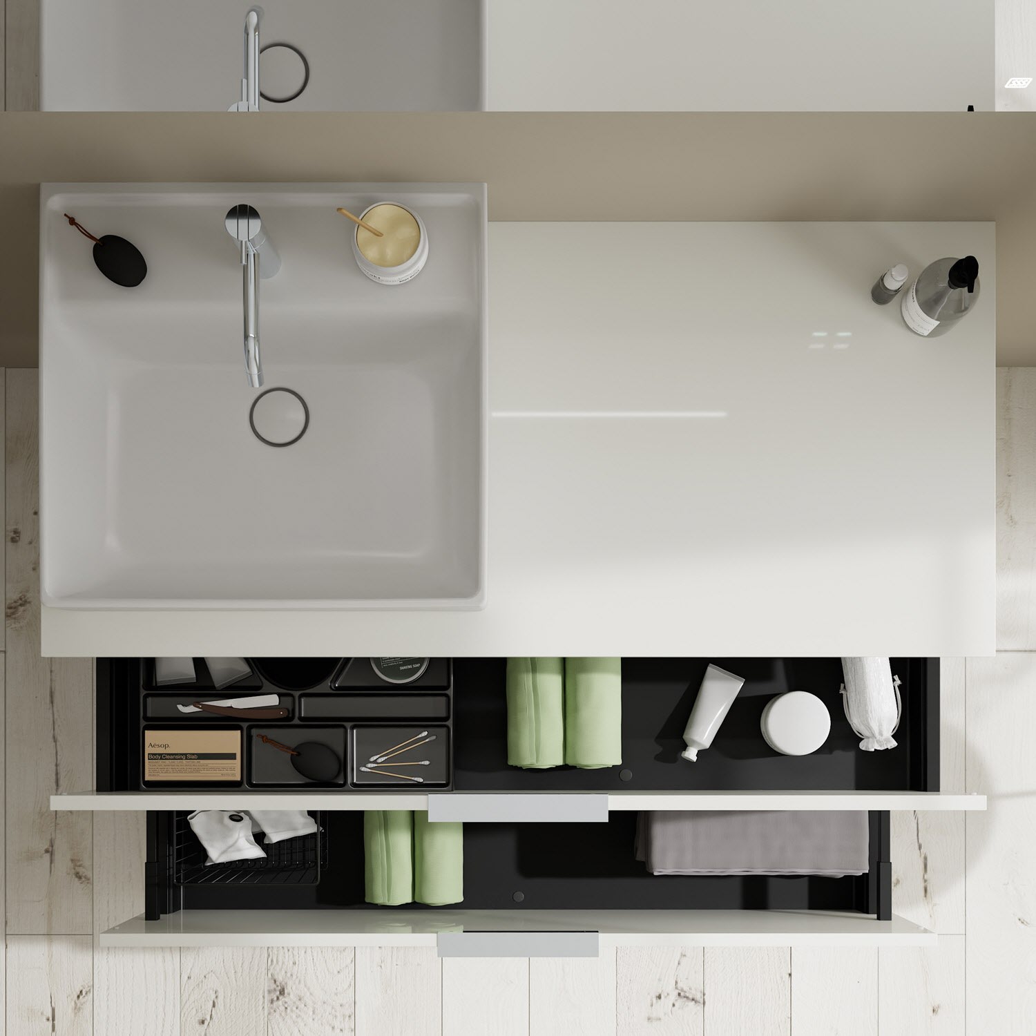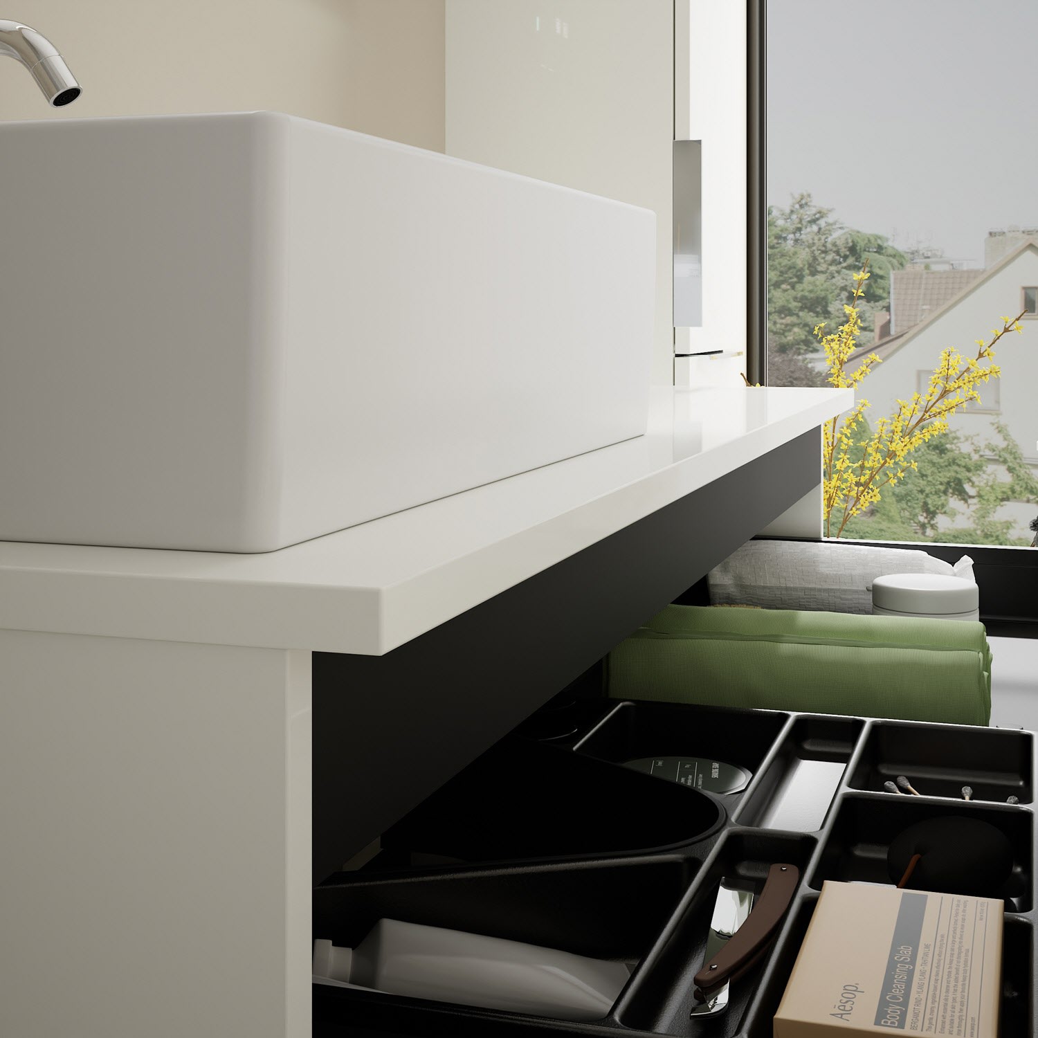 - 1 Schublade oben, 35 cm tief, mit Siphonausschnitt und Inneneinteilung