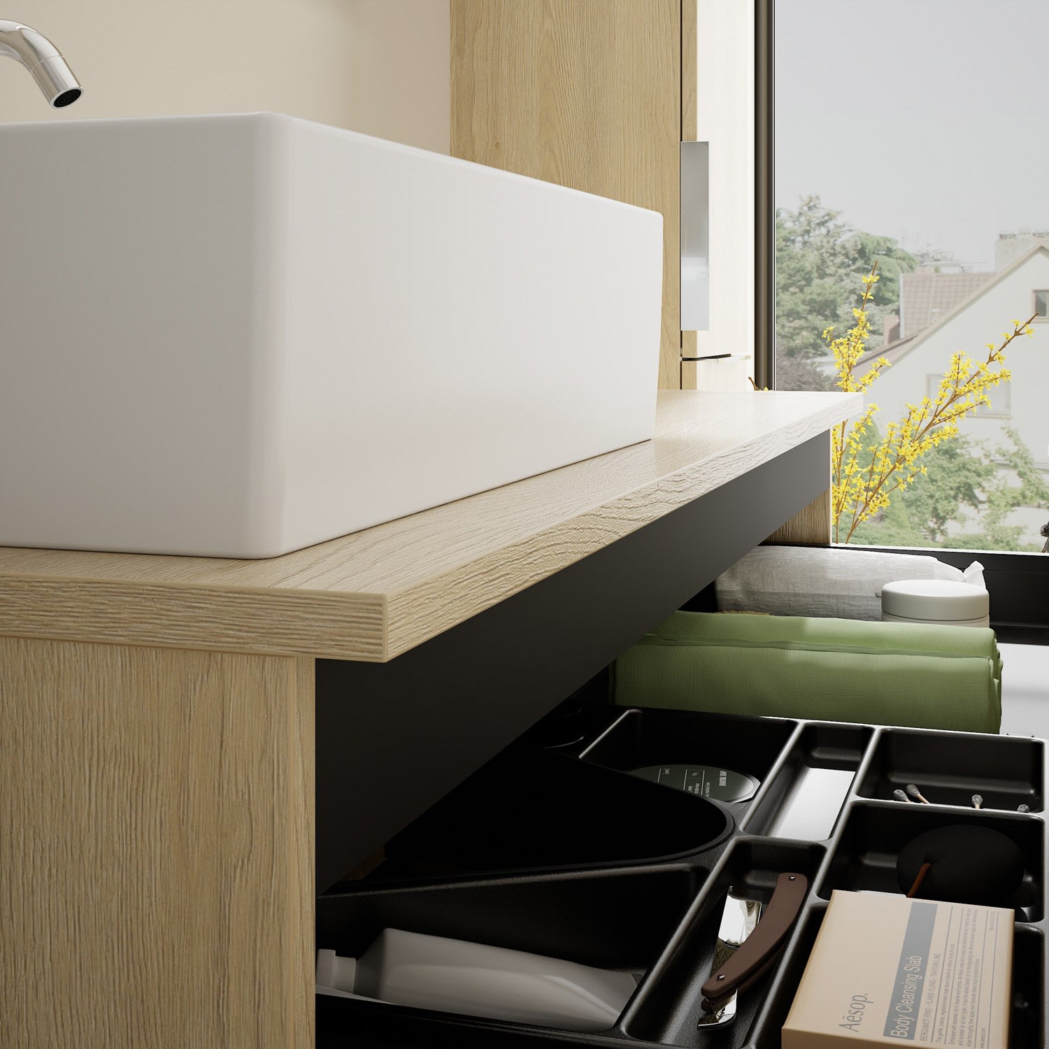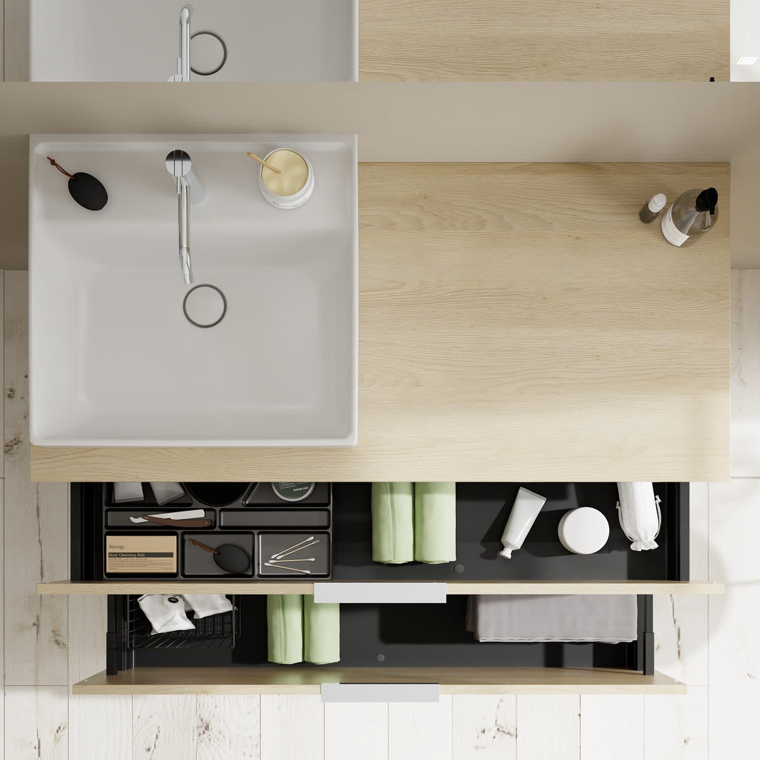 - 1 Schublade oben, 35 cm tief, mit Siphonausschnitt und Inneneinteilung