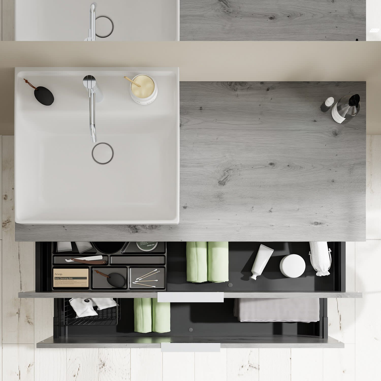 - 1 Schublade oben, 35 cm tief, mit Siphonausschnitt und Inneneinteilung