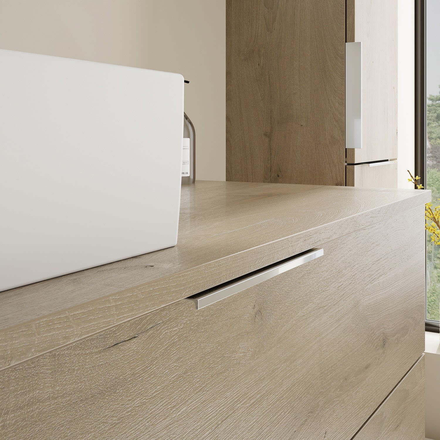 - 1 Schublade oben, 35 cm tief, mit Siphonausschnitt und Inneneinteilung
