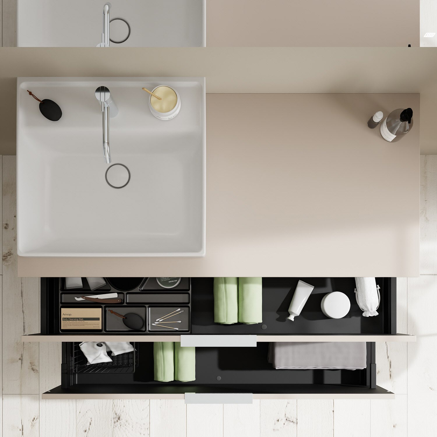 - 1 Schublade oben, 35 cm tief, mit Siphonausschnitt und Inneneinteilung
