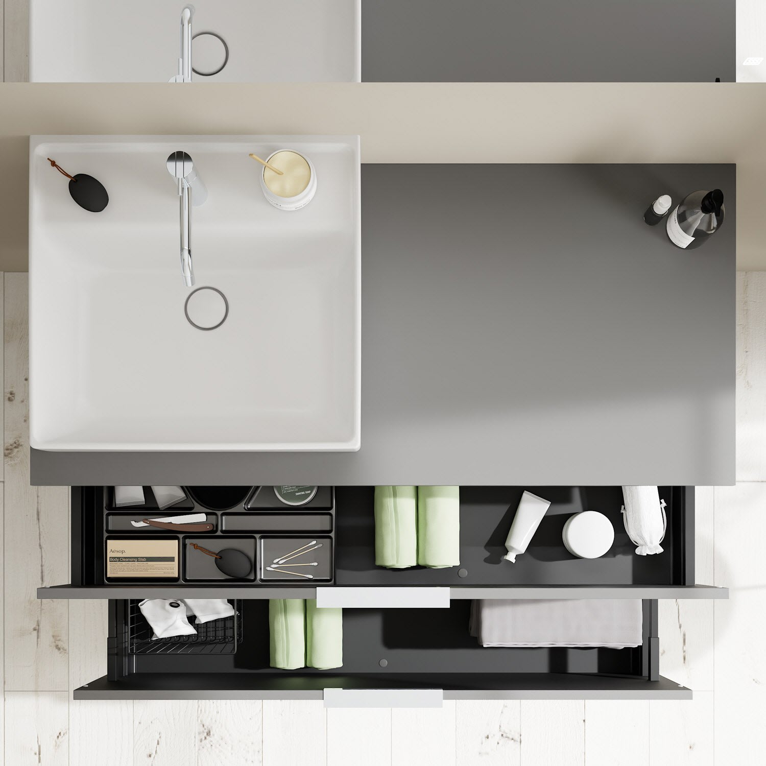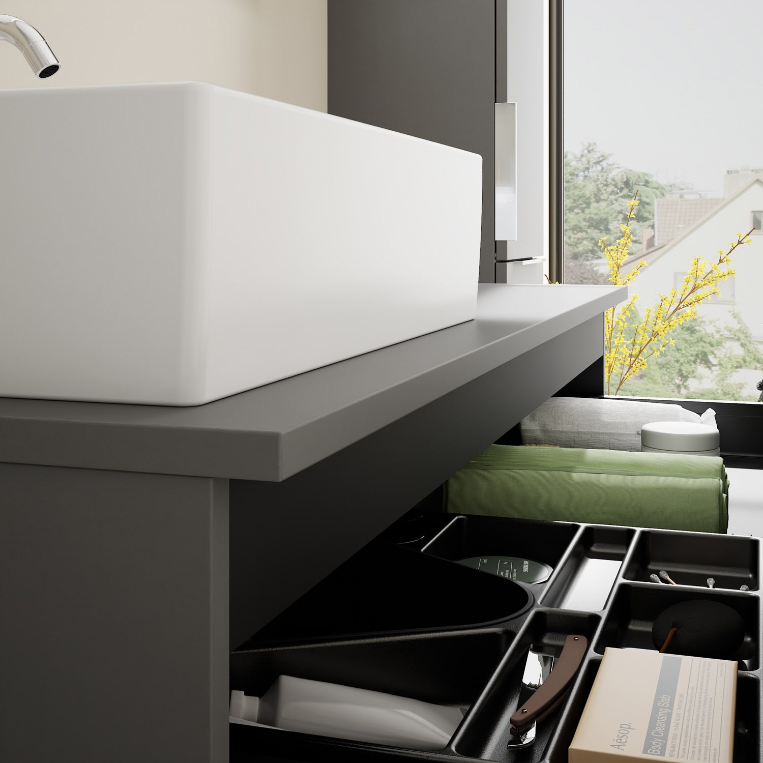 - 1 Schublade oben, 35 cm tief, mit Siphonausschnitt und Inneneinteilung