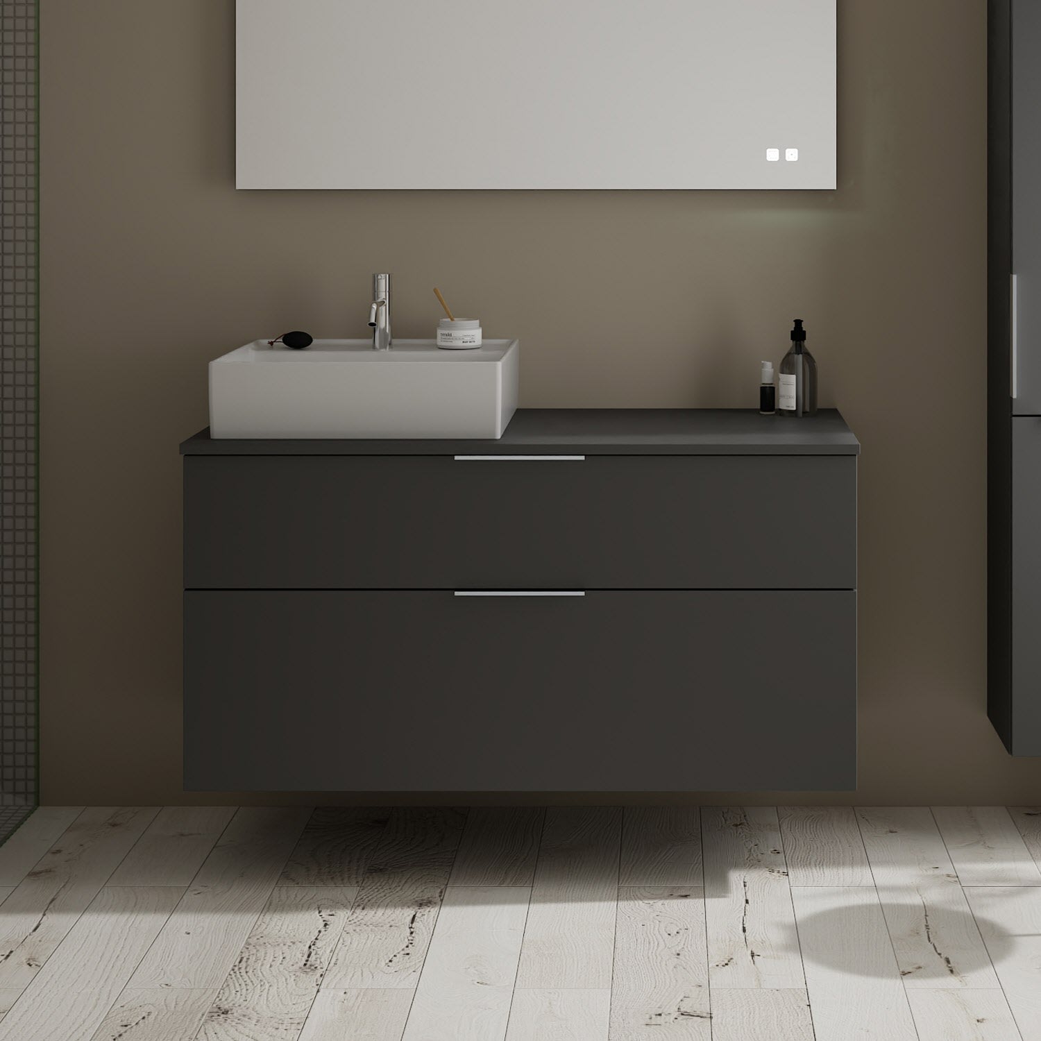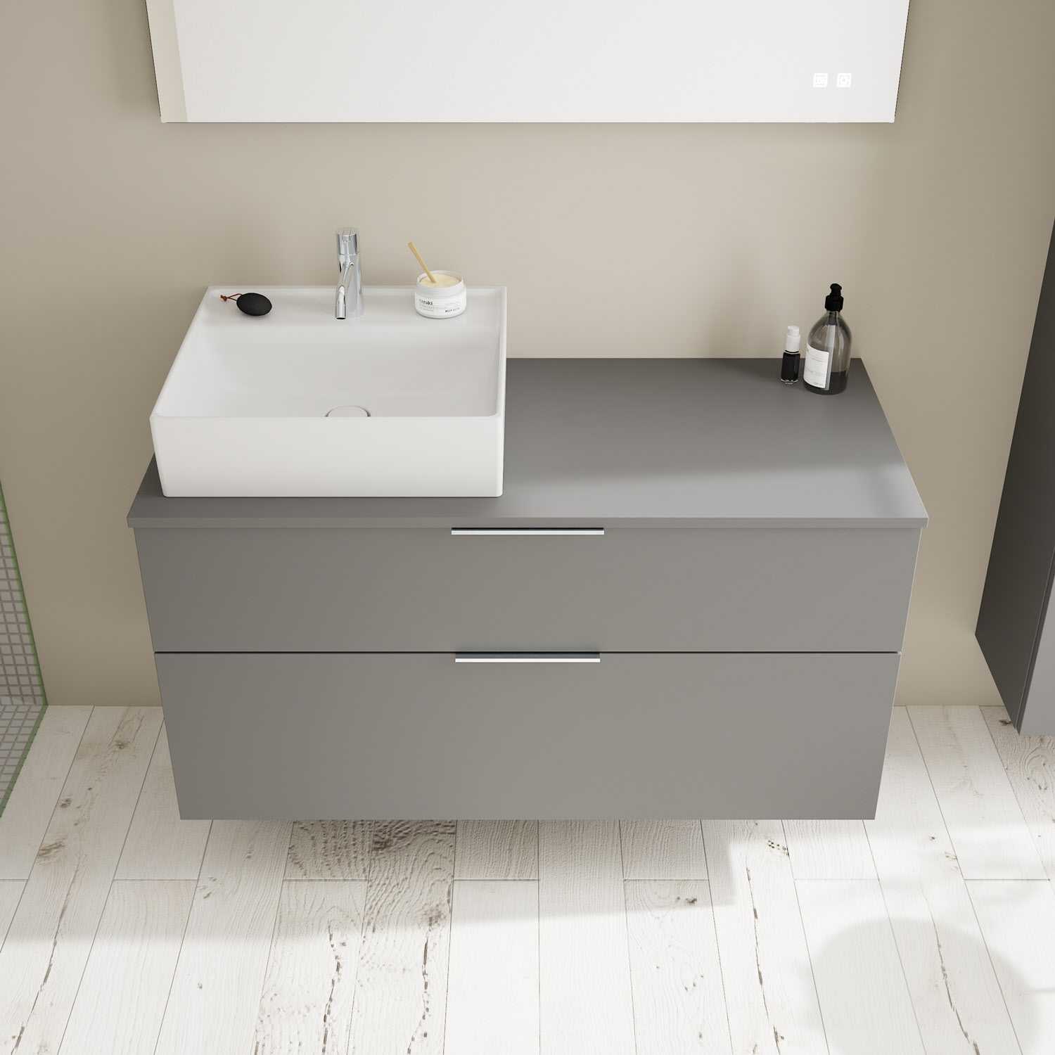 burgbad Eqio Waschtischkombination mit Keramik-Aufsatzwaschtisch 120 cm, links, mit Griff G0146