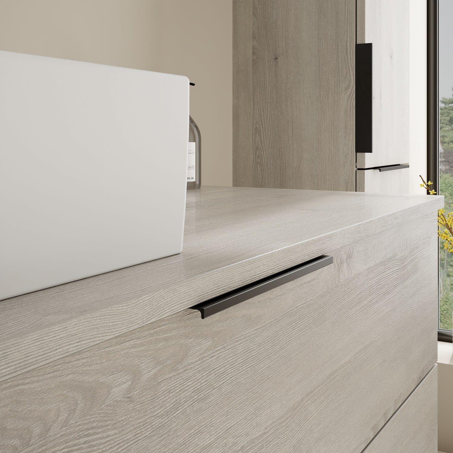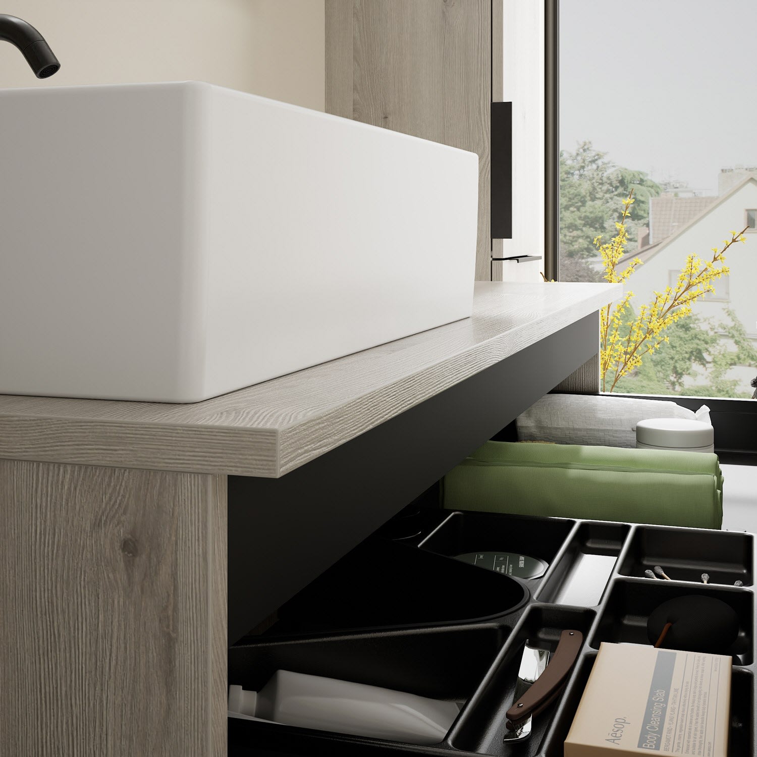 - 1 Schublade oben, 35 cm tief, mit Siphonausschnitt und Inneneinteilung