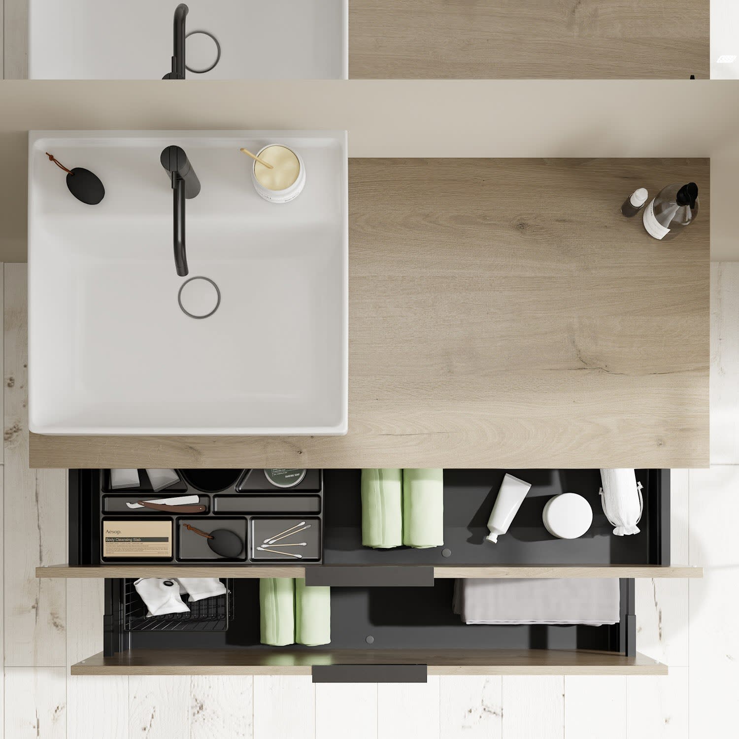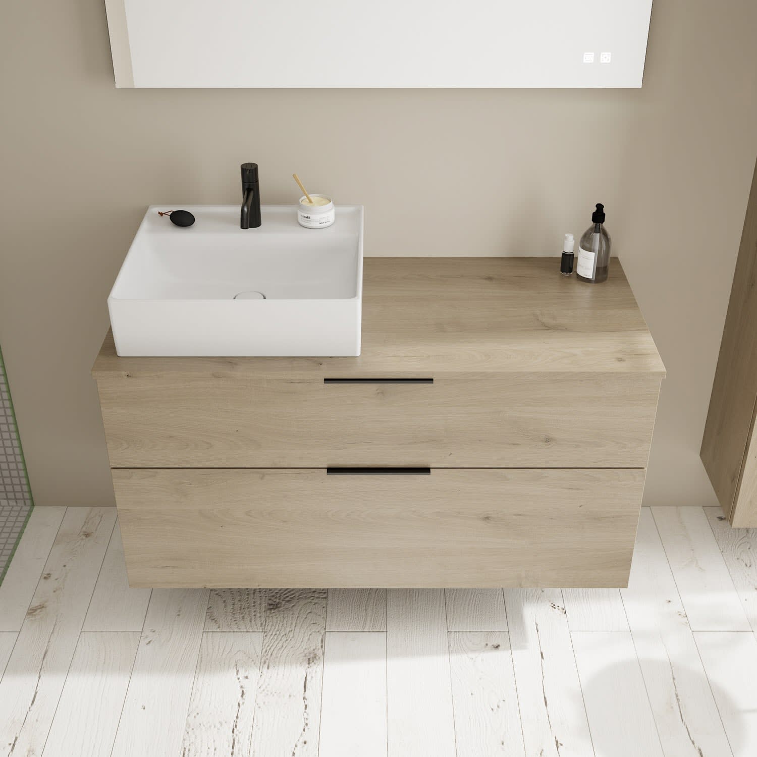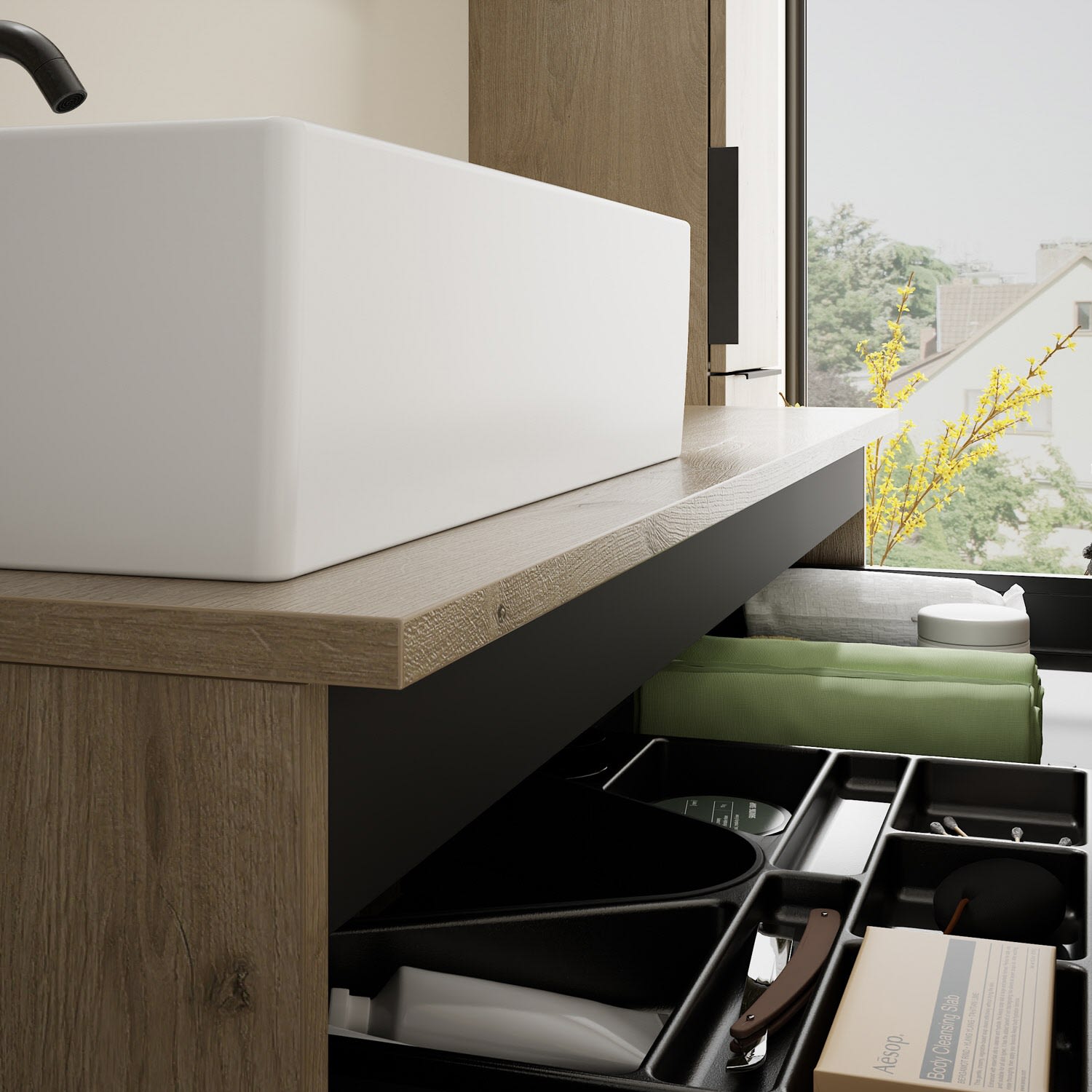 - 1 Schublade oben, 35 cm tief, mit Siphonausschnitt und Inneneinteilung