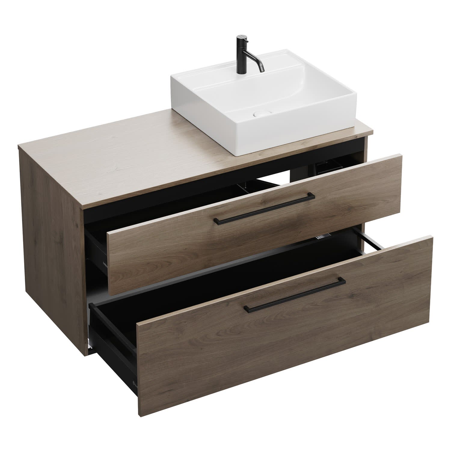 - 1 Schublade oben, 35 cm tief, mit Siphonausschnitt und Inneneinteilung
