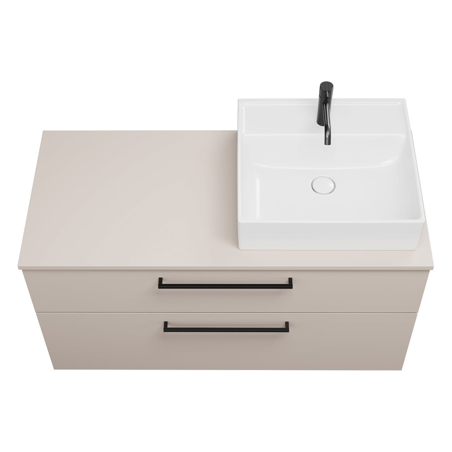- 1 Schublade oben, 35 cm tief, mit Siphonausschnitt und Inneneinteilung