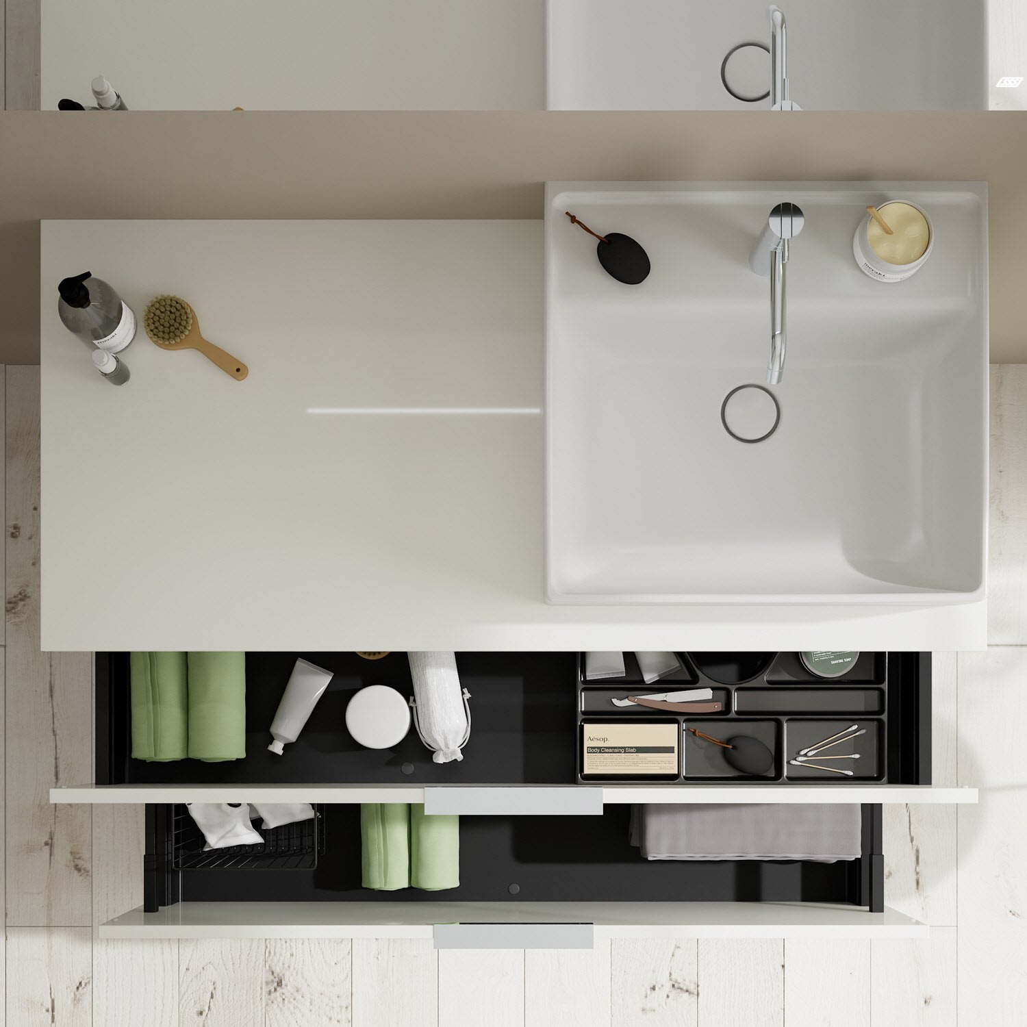 - 1 Schublade oben, 35 cm tief, mit Siphonausschnitt und Inneneinteilung