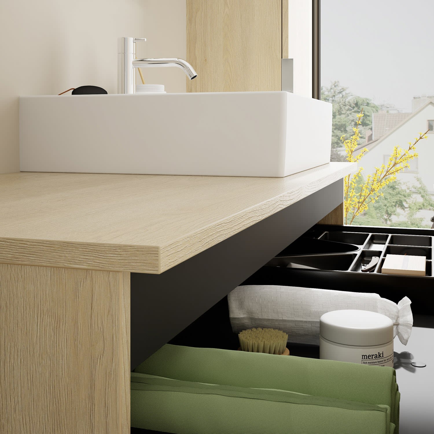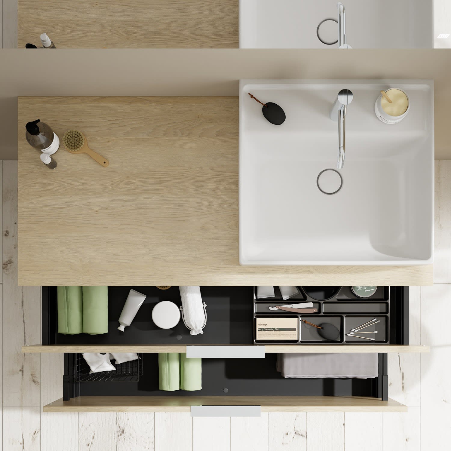 - 1 Schublade oben, 35 cm tief, mit Siphonausschnitt und Inneneinteilung