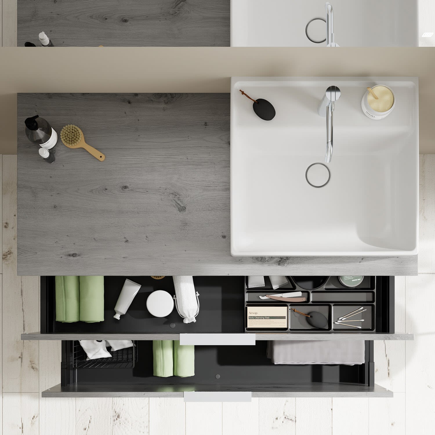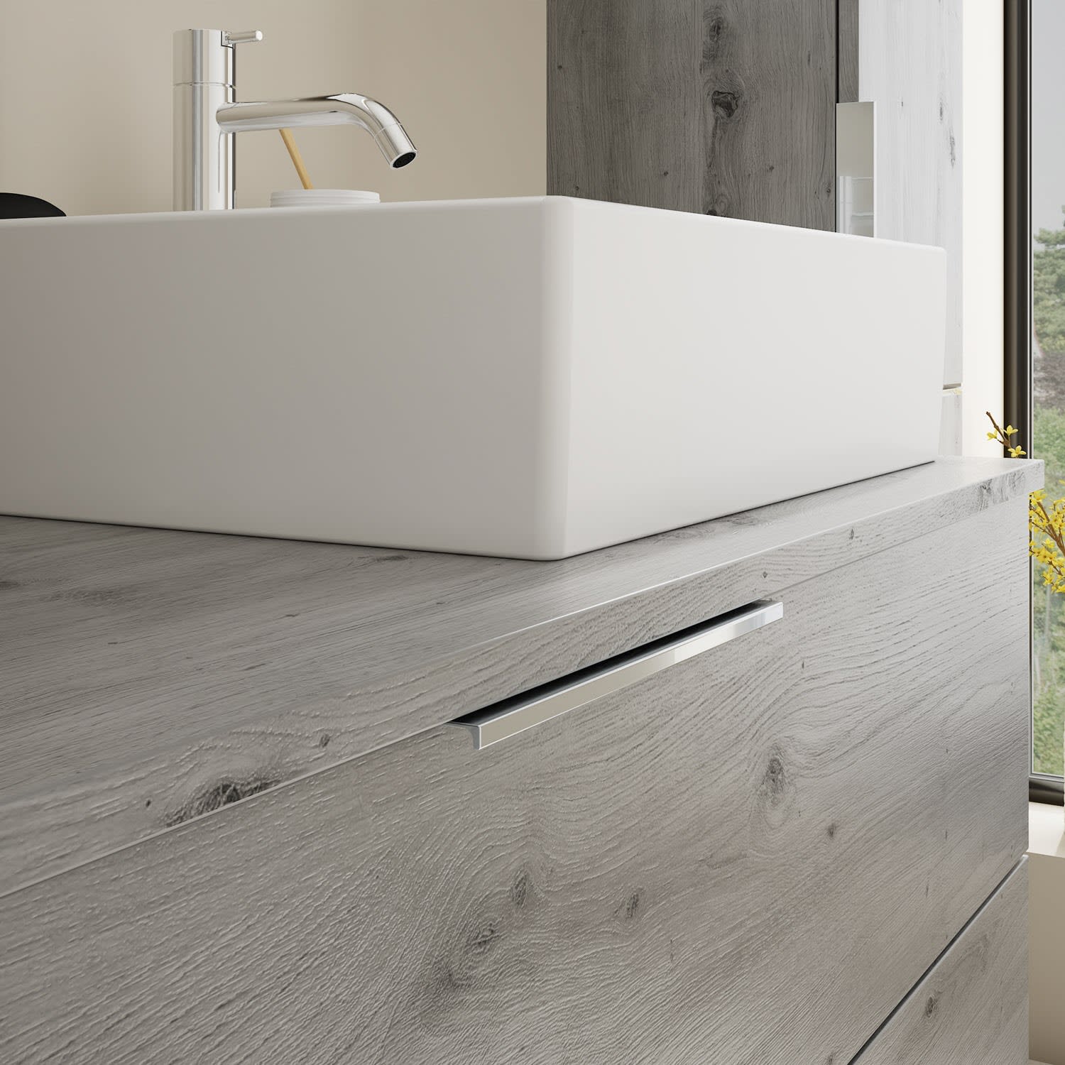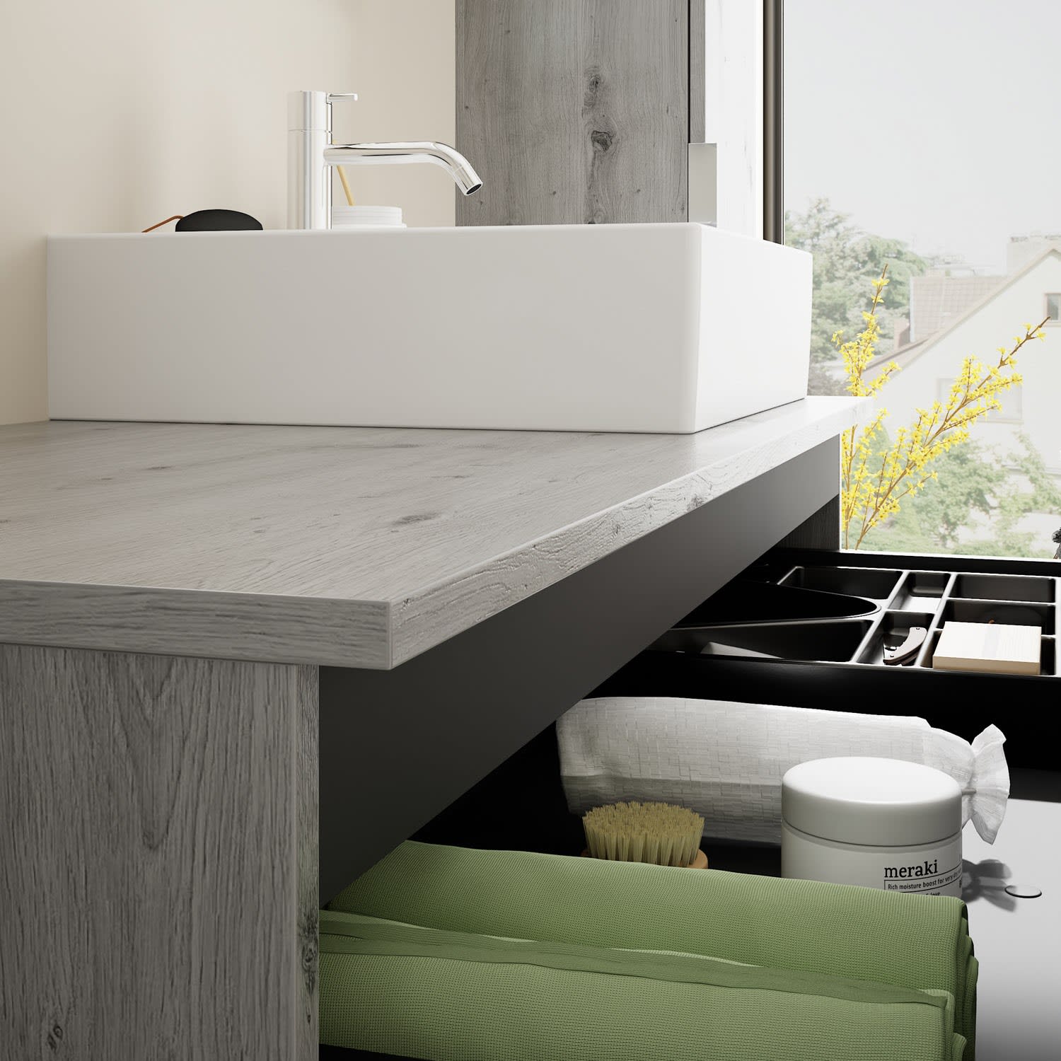 - 1 Schublade oben, 35 cm tief, mit Siphonausschnitt und Inneneinteilung