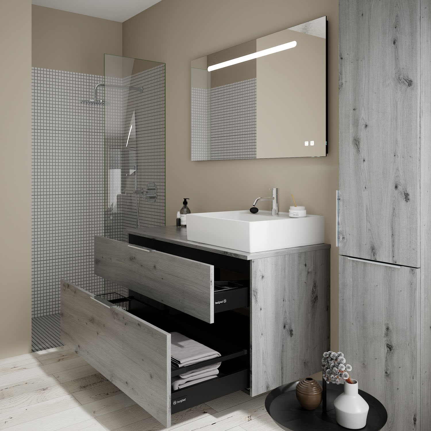 burgbad Eqio Waschtischkombination mit Keramik-Aufsatzwaschtisch 120 cm, rechts, mit Griff G146