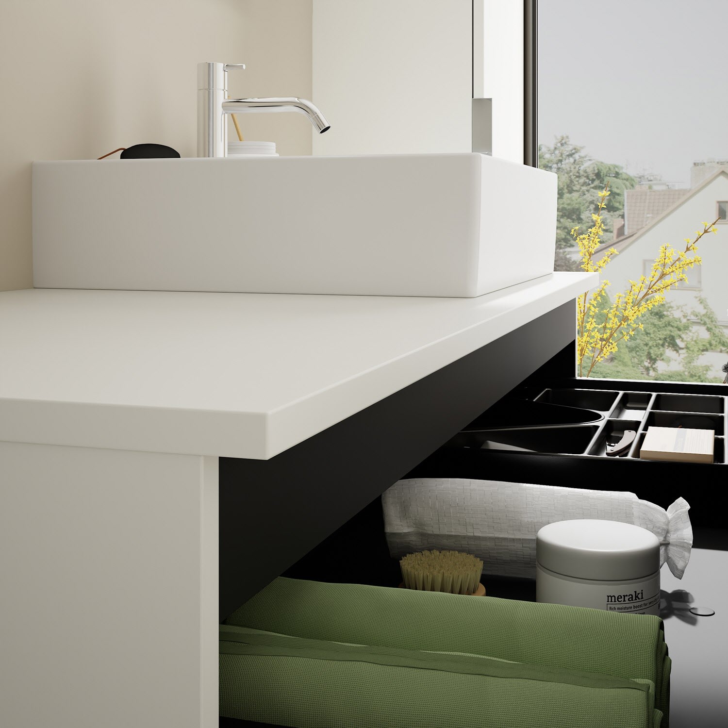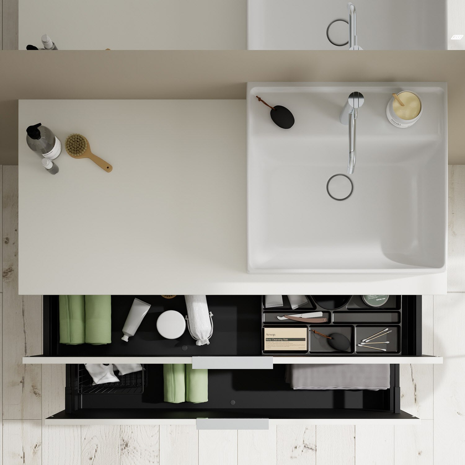 - 1 Schublade oben, 35 cm tief, mit Siphonausschnitt und Inneneinteilung