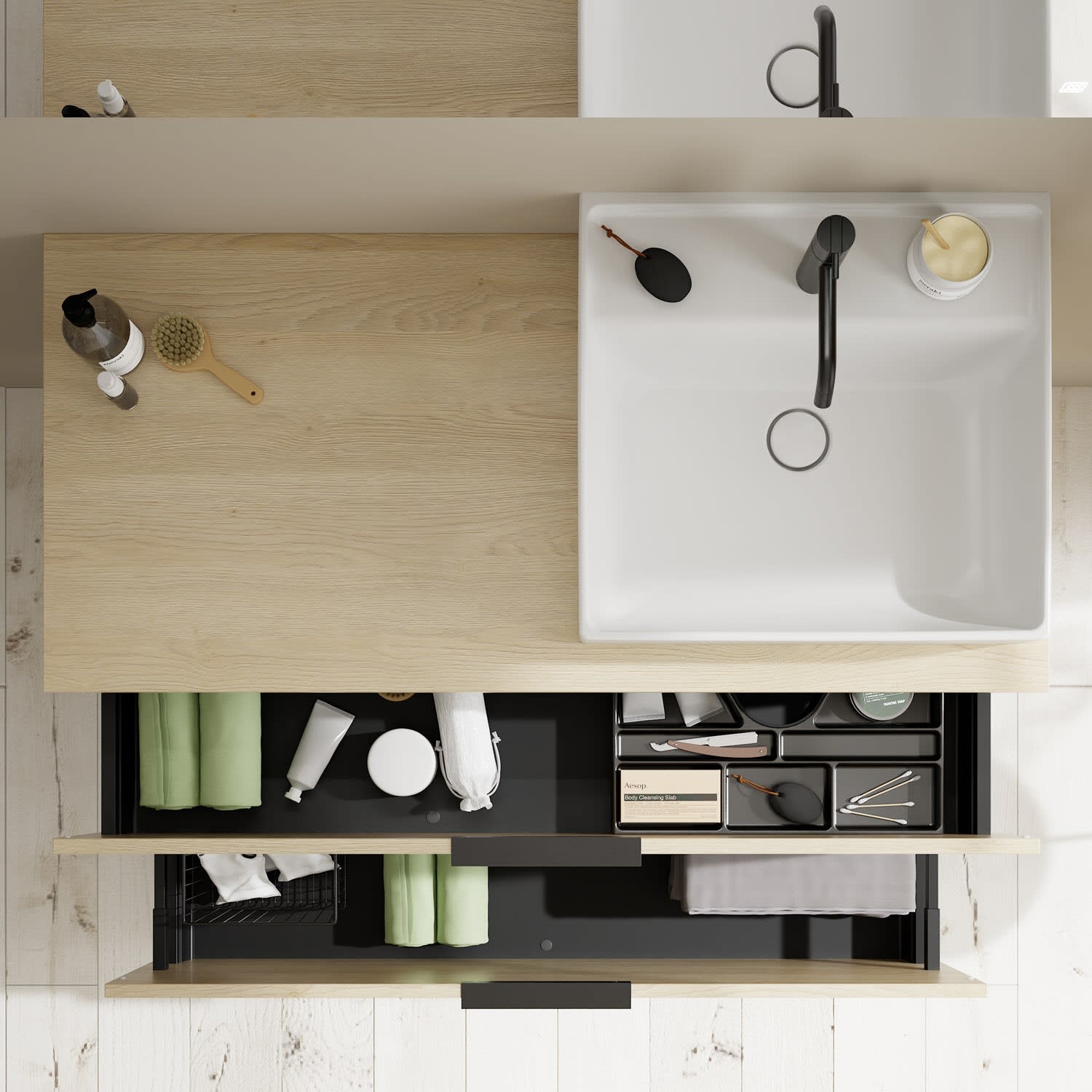 - 1 Schublade oben, 35 cm tief, mit Siphonausschnitt und Inneneinteilung