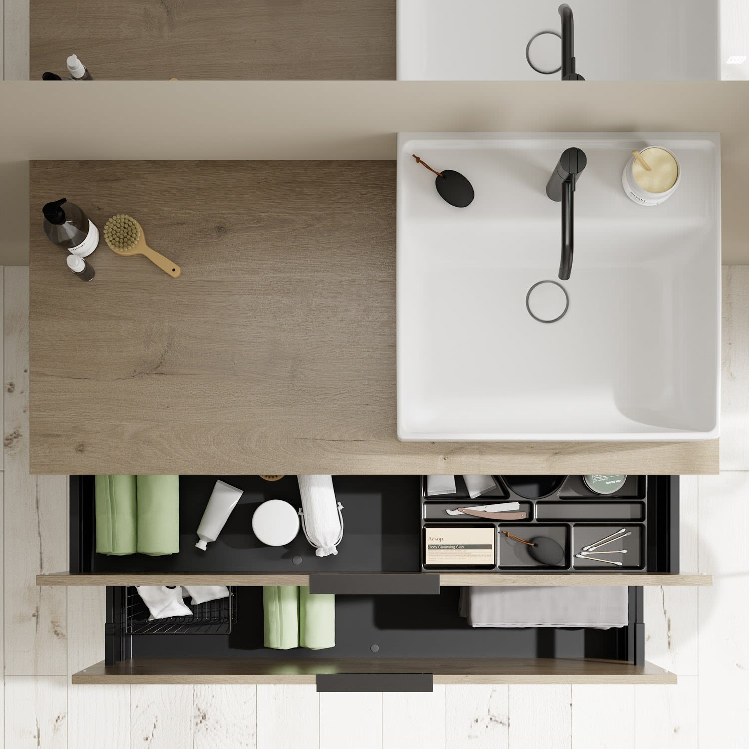- 1 Schublade oben, 35 cm tief, mit Siphonausschnitt und Inneneinteilung