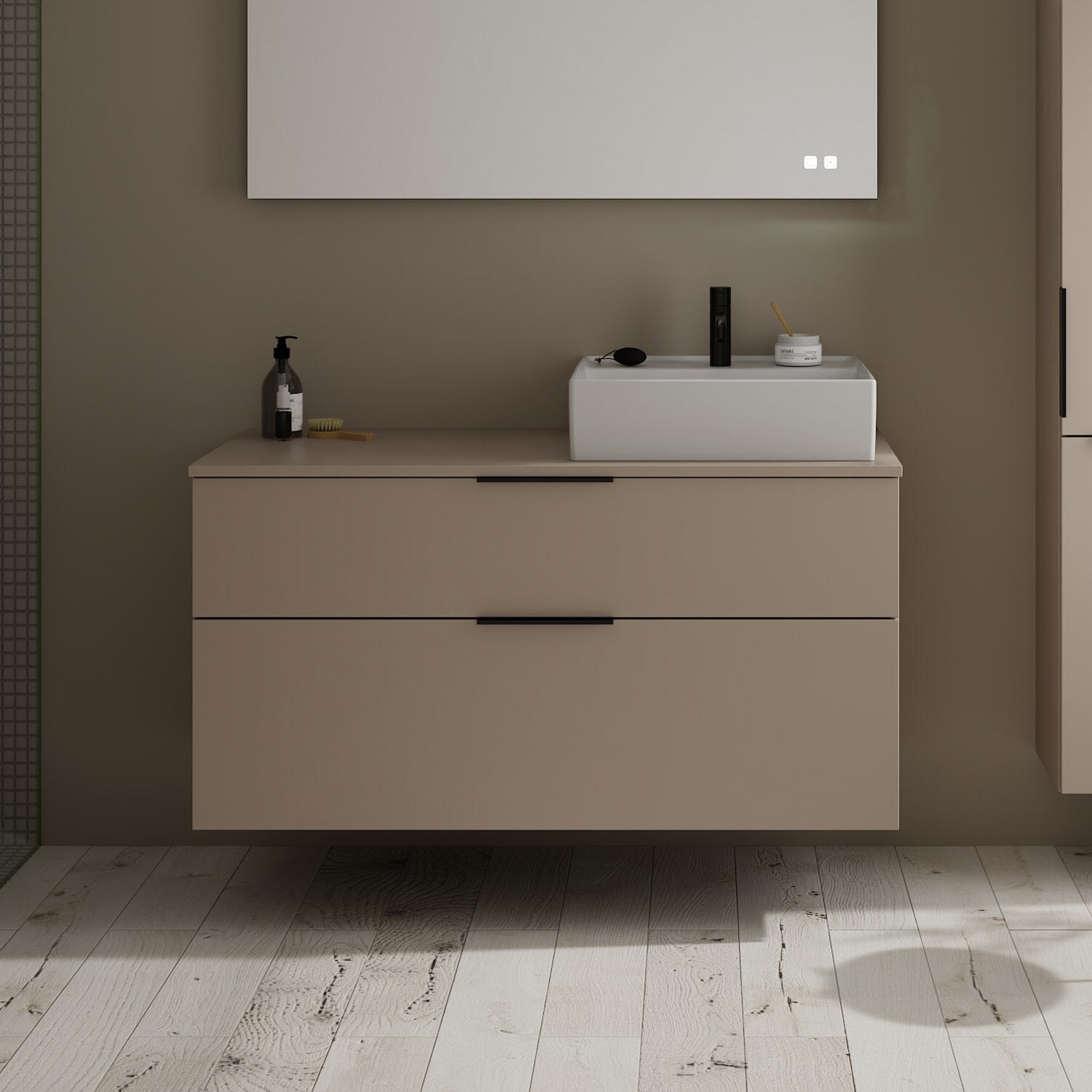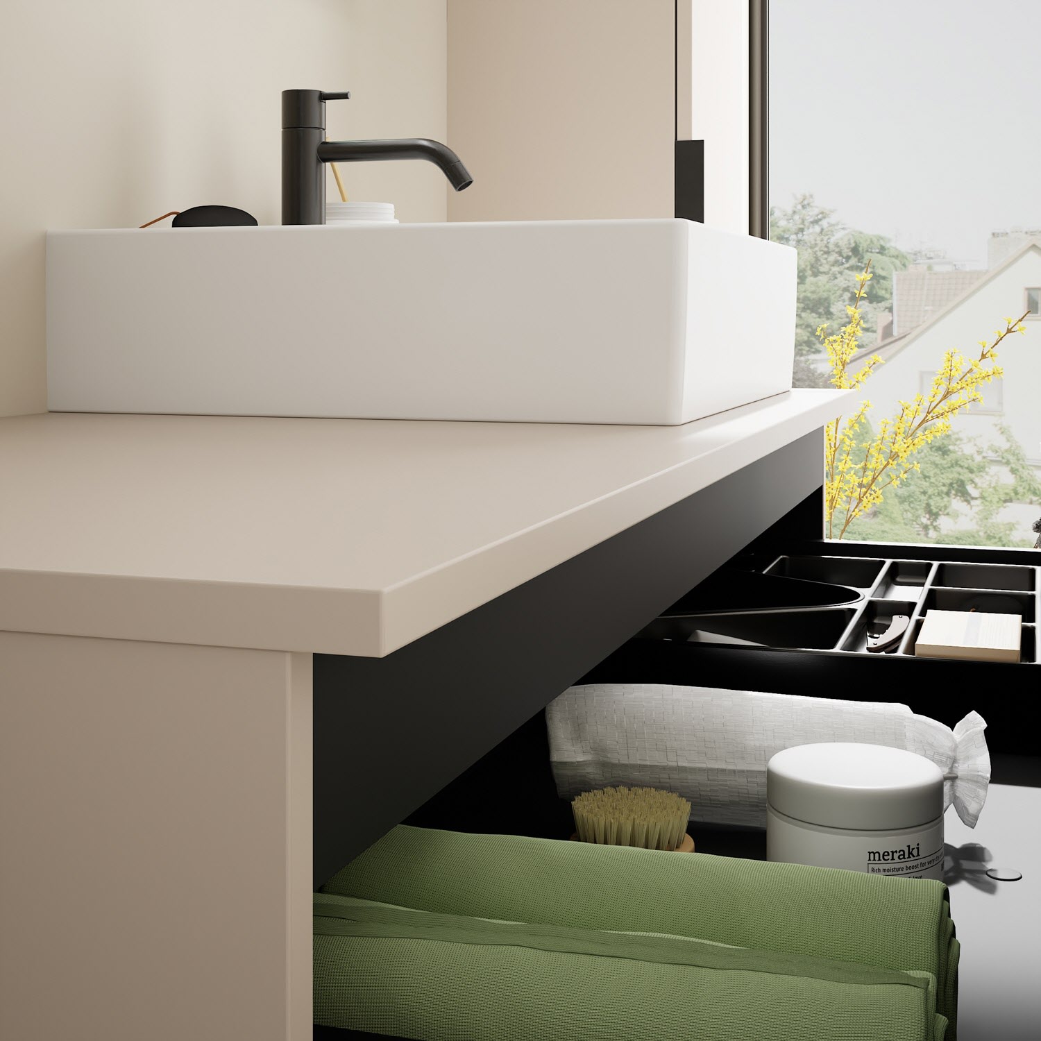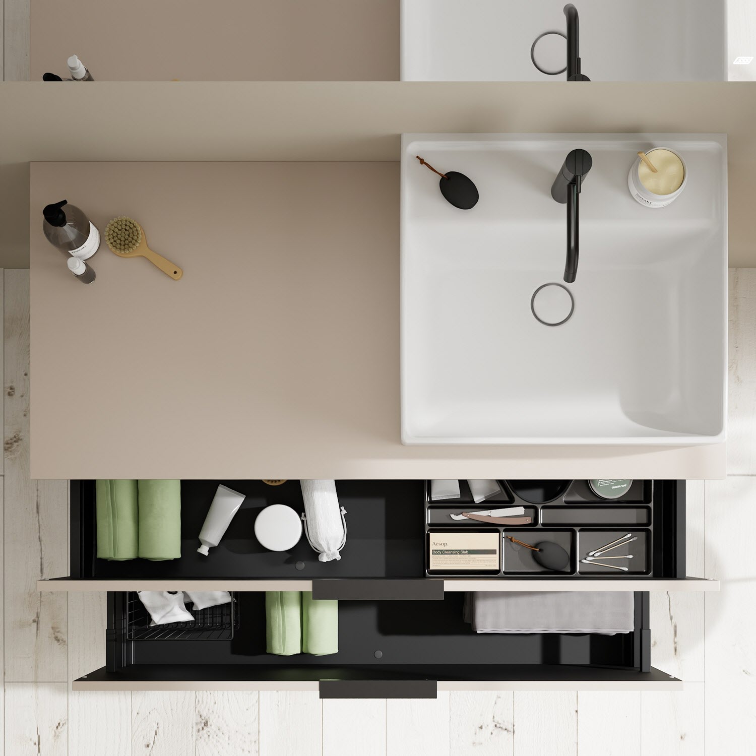 - 1 Schublade oben, 35 cm tief, mit Siphonausschnitt und Inneneinteilung